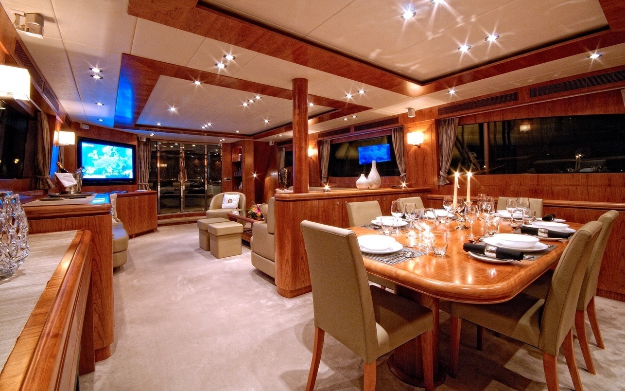 Her lovely contemporary interior décor is serene and neutral, boasting beautiful leathers, high gloss warm wood panelling and soft lighting. The open plan main salon and dining area is perfect for socializing, providing a sumptuous lounge and entertainment systems aft, as well as a formal dining table and piano forward. She features a country style galley forward of the salon, where guests may enjoy a relaxed atmosphere, ideal for breakfast or evening canapes.