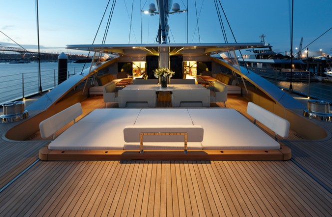 Interior of the Vertigo sailing yacht is extremely comfortable; light floods in all around, especially in the main deck saloon. The sides of the superstructure are transparent, bringing the outside into the saloon. The perfect integration of deck saloon and cockpit create a seamless living area 30 m long. The lower deck layout boasts four guest rooms and a huge owner’s state room aft. The passage from this cabin leads directly to the lazarette and swim platform. Forward there is enough accommodation for 11 crew. Find out more about Vertigo yacht here …