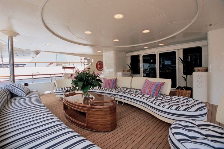 Her aft deck is well endowed with settees and tables and her impressive main saloon areas provides a bar and a relaxing area with a 50” Plasma TV screen. Her elegant dining room can seat up to 10 around a lovely oval table. The yacht’s ten large side windows create gorgeous vistas throughout. Seven Sin’s upper deck saloon conveys an Asian ambience and can also be used as a theatre area with its 60″plasma screen. Her upper deck has a dinning or lunch table for 12 and her sun deck a table for 10, a Spa Pool, and sun mattresses. More about SEVEN SINS yacht here …