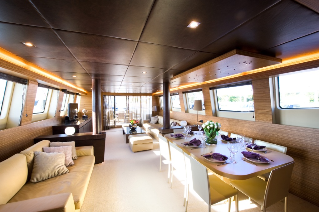 Stepping inside the yacht’s salon, there is a large lounge, with formal dining situated forward. An overall neutral décor creates an inviting and relaxed ambience.
