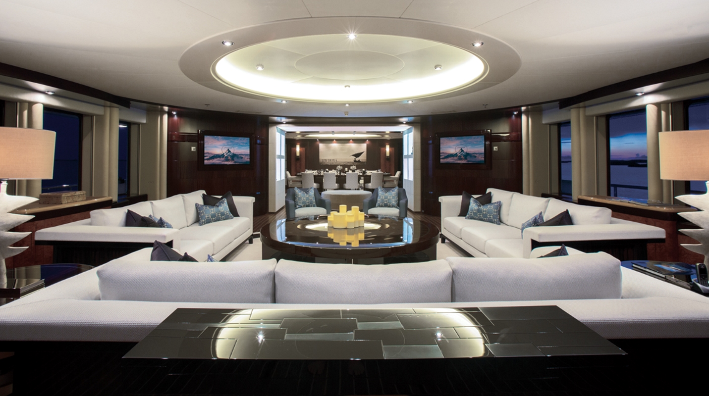 The contemporary interior plays with contrasts between dark and light, using the natural light of day to flood the interiors and create a welcoming social space for guests and visitors alike. In the evening, there is more than sufficient light for continuing activities and for late night dining in the stately formal dining area forward of the main salon.
