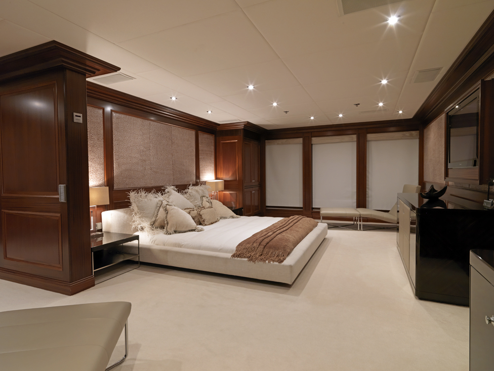 Her interior décor is welcoming and elegant, featuring beautiful woods, neutral fabrics, suedes and silks. The main salon offers a sumptuous lounge with plenty of seating, surrounded by large windows delivering fabulous natural light. The master stateroom is situated forward and full beam of the vessel.