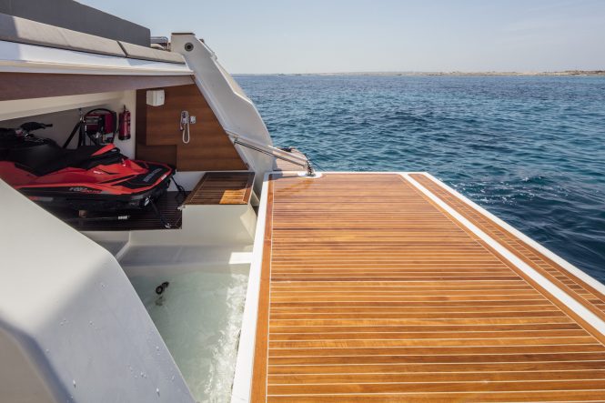 The NAVETTA 33 also incorporates a great amount of cutting-edge technology, including sound dampening and noise insulation, hydro-electric stabilising fins with Seakeeper gyroscopic stabilisers, and a patented DMT system that allows the garage door to fold back and create a spacious beach club.
