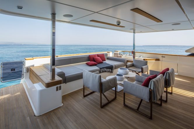 The upper deck compares in size to most main decks of other 33m/108ft superyachts, and this additional room is put to use providing guests with comfortable living areas while also providing the captain with his own quarters directly behind the helm.