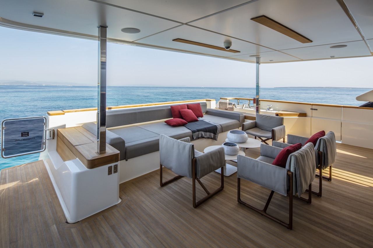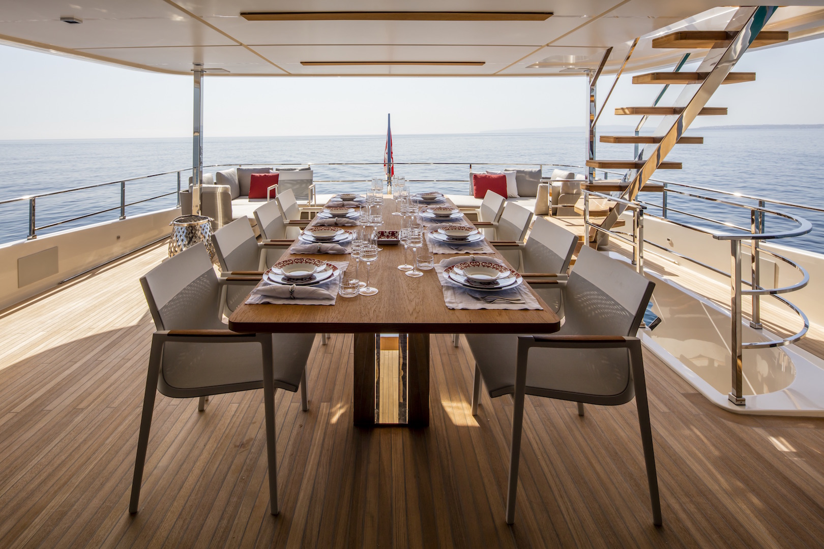 Owners have a choice of two layouts that either places the formal dining area inside the skylounge or out onto the upper deck aft: The owner of the first NAVETTA 33 has opted for this outdoor dining layout for even greater space in the skylounge. The alfresco dining table will be made of teak and polished stainless steel and will be coupled with 10 Dedonwhite Dean chairs with wooden armrests.