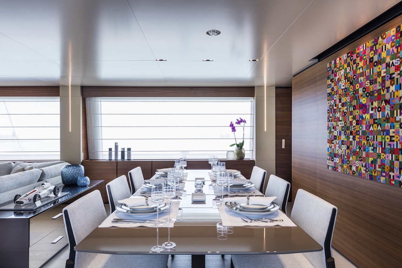 The cockpit is fitted with a large sofa, outdoor chairs and side tables for relaxed alfresco dining and conversation. A 4m/13ft glass sliding door and a curtain separate the cockpit from the main salon, containing an ivory-coloured seating area and two tables, one lacquered in a caramel colour and the other in Noir Saint Lauren marble. A widescreen TV slides out of the cabinetry which also stores a fridge. A starboard glass door opens up onto a walkway where the gunwale can be turned into a terrace.