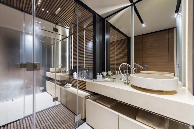 The majority of guest accommodation is located on the lower deck: three double cabins and one twin cabin, all of which have en-suite facilities and large windows at water level to provide exceptional views and plenty of natural light. Each bathroom is fitted with a white Corian custom-made sink and the shower cladding and countertops are done in marble.