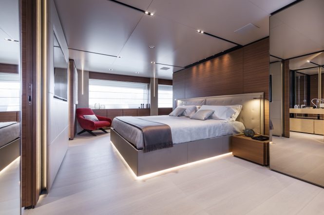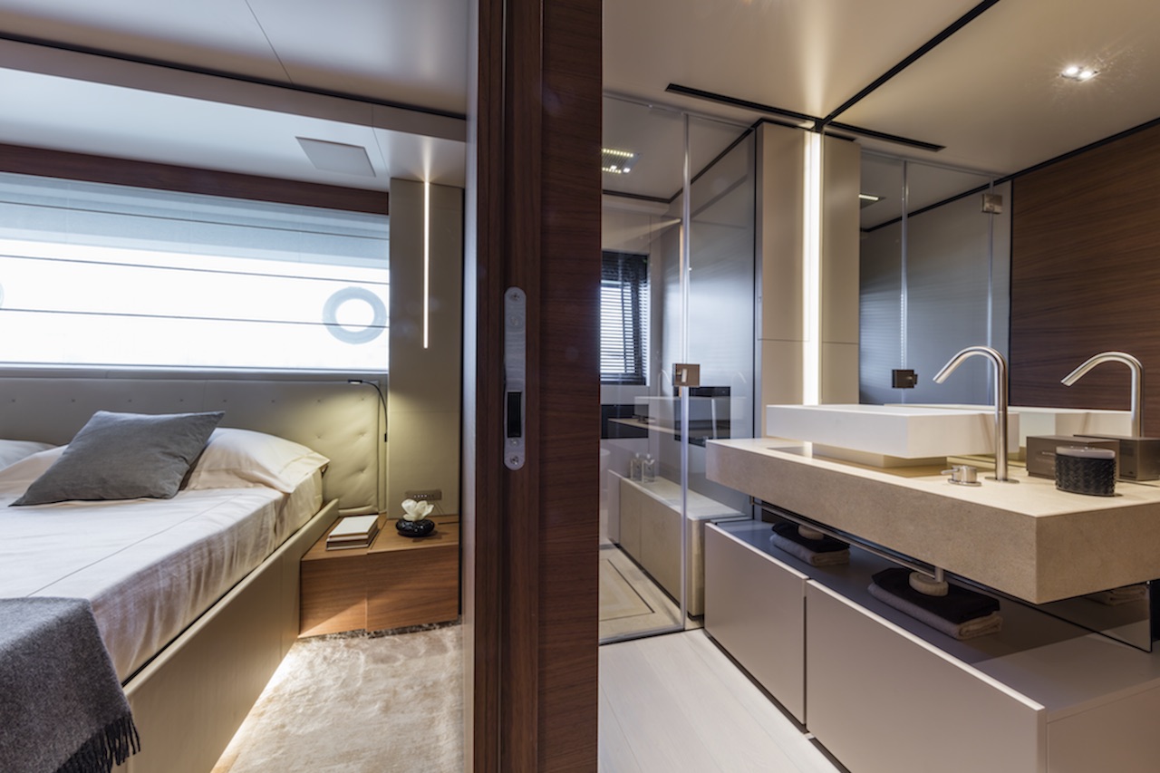 A private study separates the Master suite from the hallway. Inside, mirrored sliding panels hide a walk-in wardrobe and the bed features a leather headboard from the Gran Torino collection by Poltrona Frau. Two doors connect to the forward bathroom, where marble is used in the sinks, countertops and showers for a truly impressive finish.