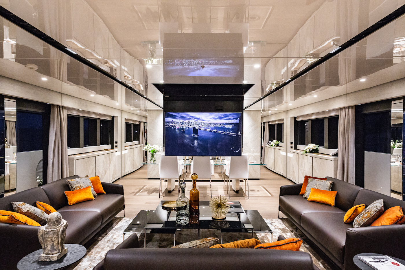 One of the greatest challenges was to install top quality audio and sound equipment while ensuring the maximum of interior space for guest socialisation. A centralised rack system was decided upon, which has been created featuring Creston processors for the AV systems and tested at the Videoworks facilities before being installed. The guest cabins also receive this benefit, and the Owner’s hallway, in particular, has built-in Sonance speakers and a 5.1 surround system.