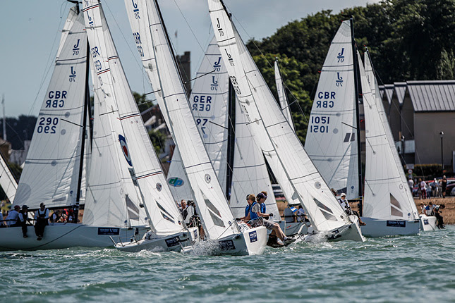 Racing got underway after a two-hour postponement to allow the breeze to build and by the first start of the day, for the J/70 class, it had filled in across the course at a consistent 10-12 knots from the west-south-west. By this time the strong east-going flood tide was starting to ease and the west-going eddy close inshore off the Royal Yacht Squadron was well established in a narrow band close to the shore.