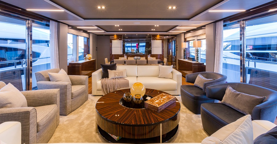 The main deck full-beam owner’s stateroom is accessed via an ante-room which can be specified as an office. The stateroom features large panoramic windows, two walk-in wardrobes and a generous bathroom with bath, shower and toilet facilities.