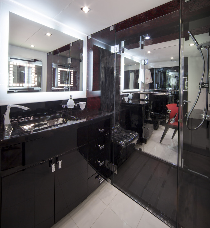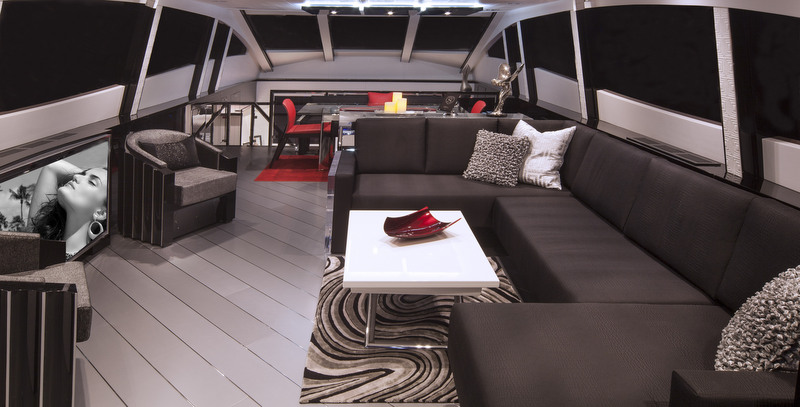 Similarly as LSX92 yacht, superyacht LSX95 features the same sporty lines, fixed hardtop and the three large, vertical hull windows in the Master stateroom, which also boasts a fold-down balcony. Both yachts also feature three additional guest staterooms.