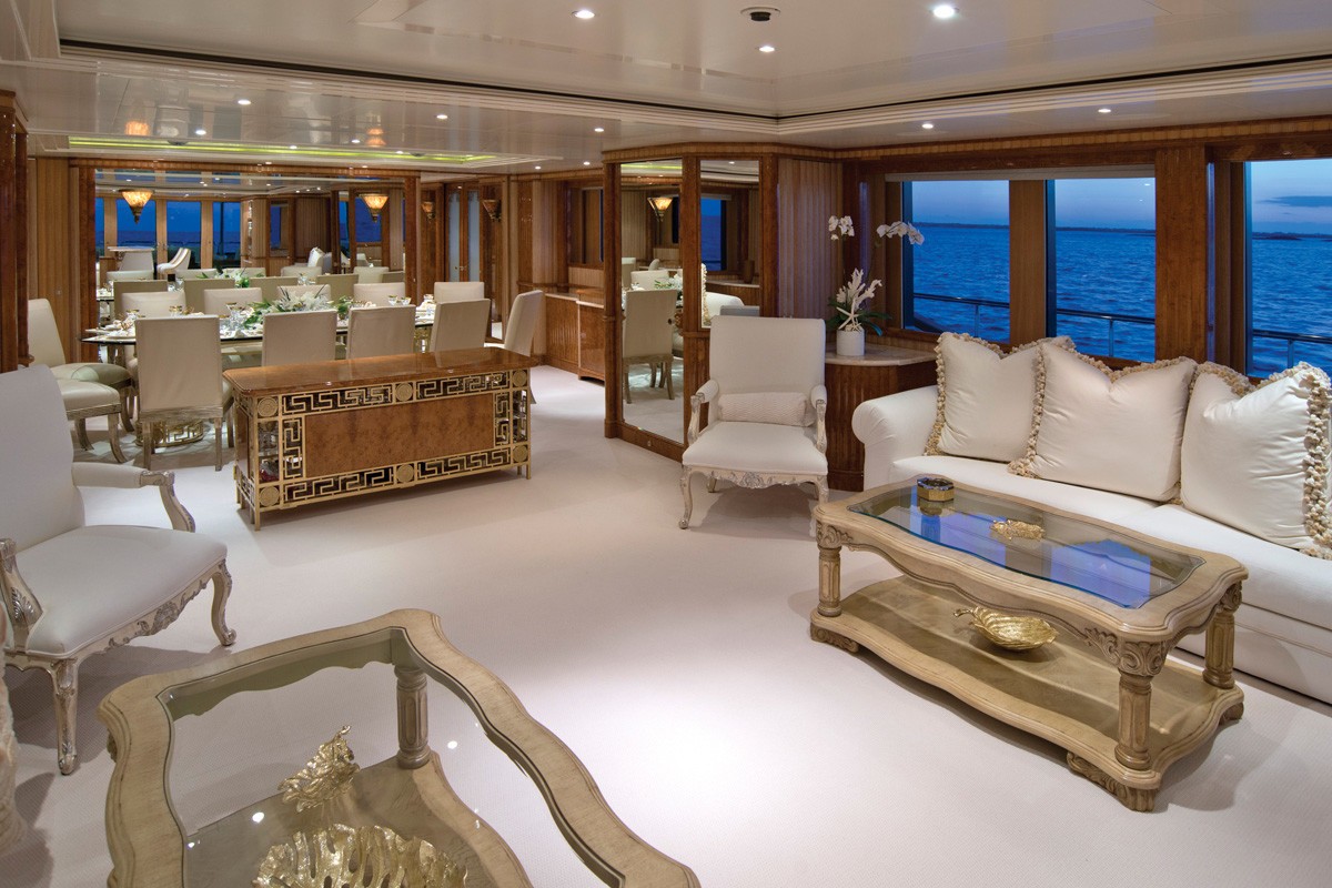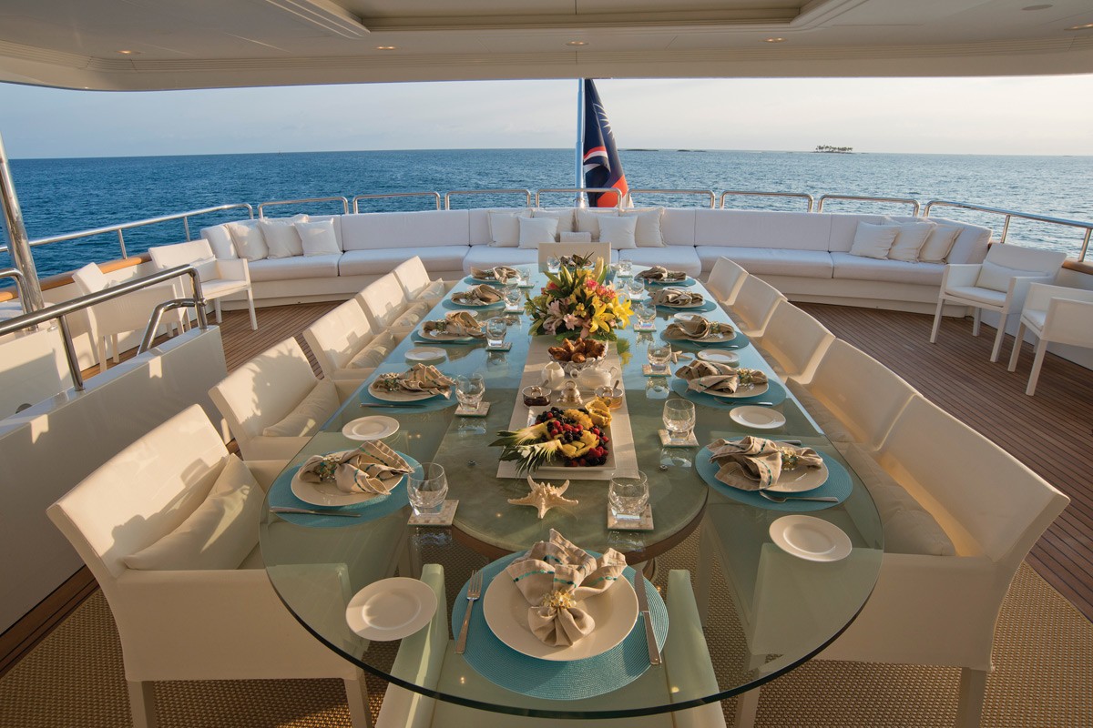 The main salon is the hub for fine dining indoors, seating the whole group around a large glass-topped table for multi-course meals coupled with a wide selection of refreshments from the bar, which is ideally positioned aft to serve guests indoors and out. The main salon provides plenty of seating for receiving visitors while dockside, and for guests on the go there is easy access to the lower deck swim platform and the tender to jet off to the next big party.