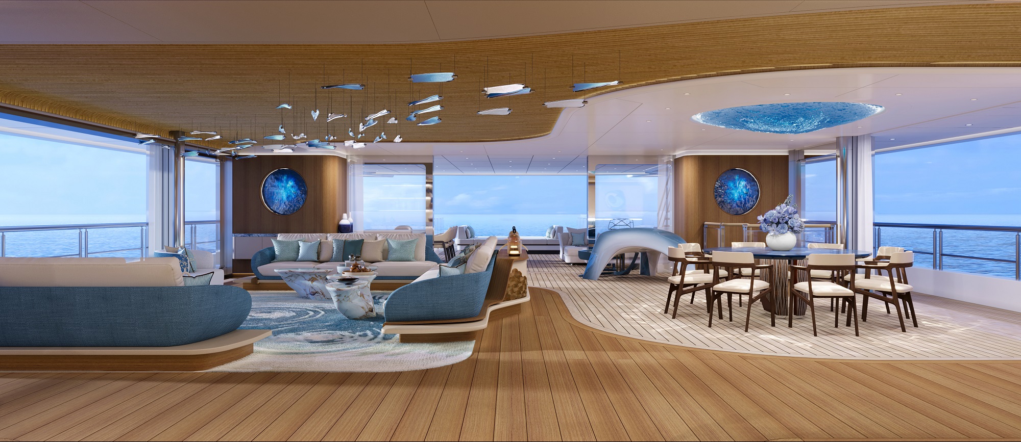 • Beach terrace: A 270sqm terrace on the aft deck which opens on three sides – including two 14m fold-down side doors – to the indoor beach club. The swim platform offers direct access to the water while the beach club is filled with light from the glass bottomed pool on the main deck.