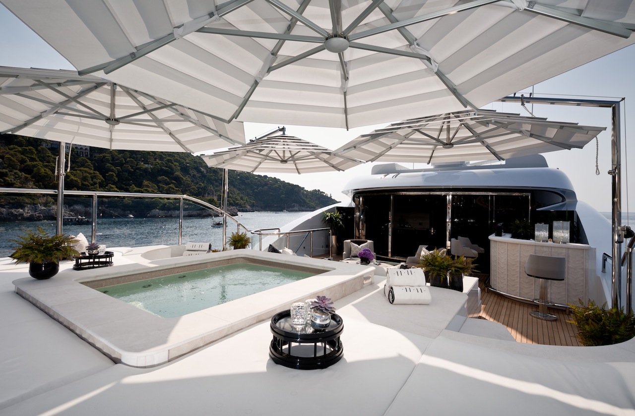 A luxury charter in the West Mediterranean during the summer months means plenty of outdoor living, and M/Y 11.11 certainly delivers, spanning over 3 decks and including a large swim platform. Her aft deck is shaded and has a built-in seating area with cocktail tables. The upper deck boasts seating, wet bar and an alfresco dining option. Forward on the upper deck, there is a private deck for the master stateroom, complete with seating and a Jacuzzi. Her sundeck is well-appointed offering an alfresco dining, sun pads, Jacuzzi, cocktail tables and wet bar.