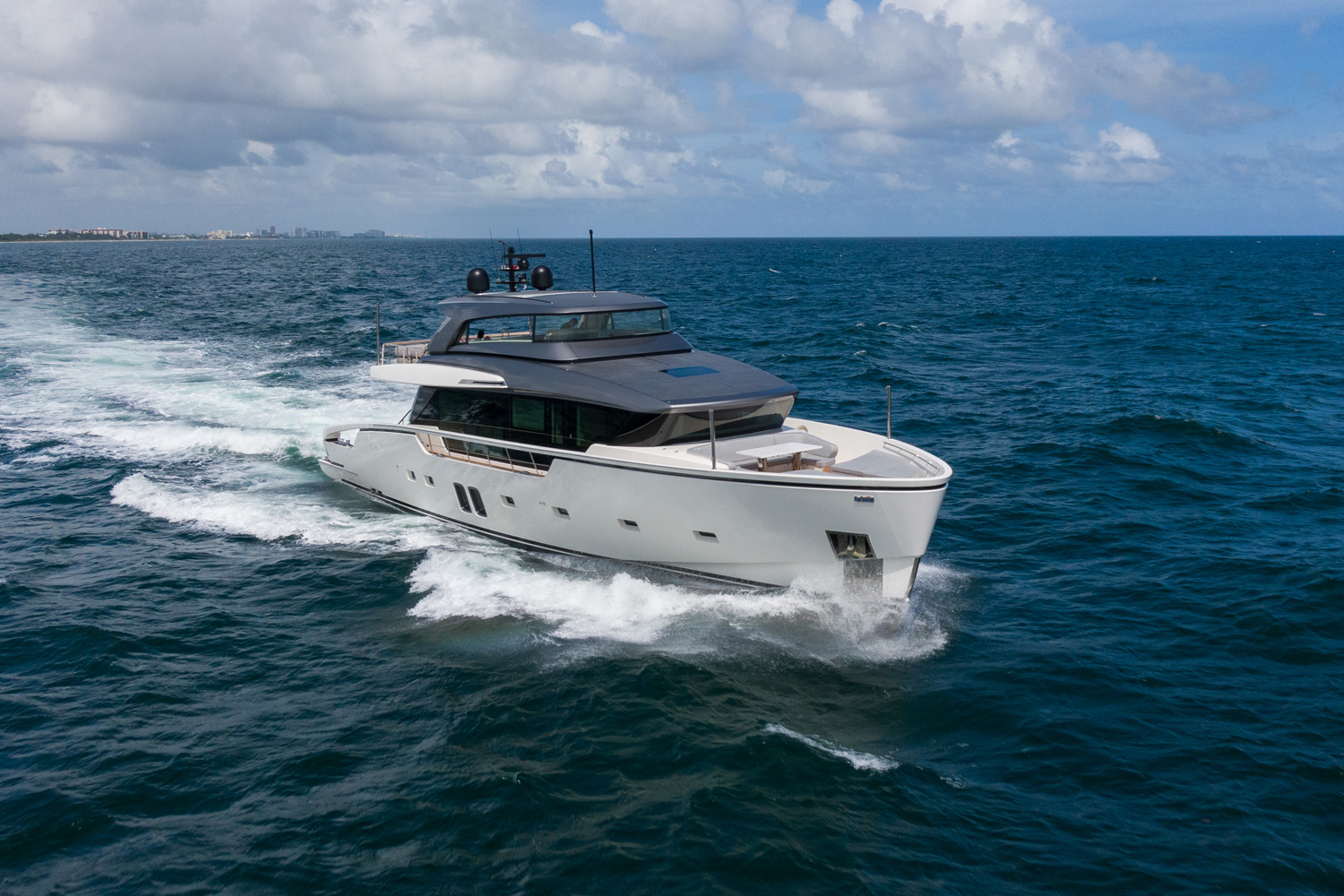This SX 88 model comes to 26.8m/88ft and offers an abundance of outdoor areas and versatile indoor spaces, ensuring that guests enjoy every moment they spend on board. The interior presents a crisp and clean feel with pale and contemporary living spaces as the light floods in through the bands of windows and the glass sliding doors aft. Greet your visitors in complete comfort and chat away the cruising hours in the air-conditioned interior, or watch a film on the widescreen TV before bedtime.