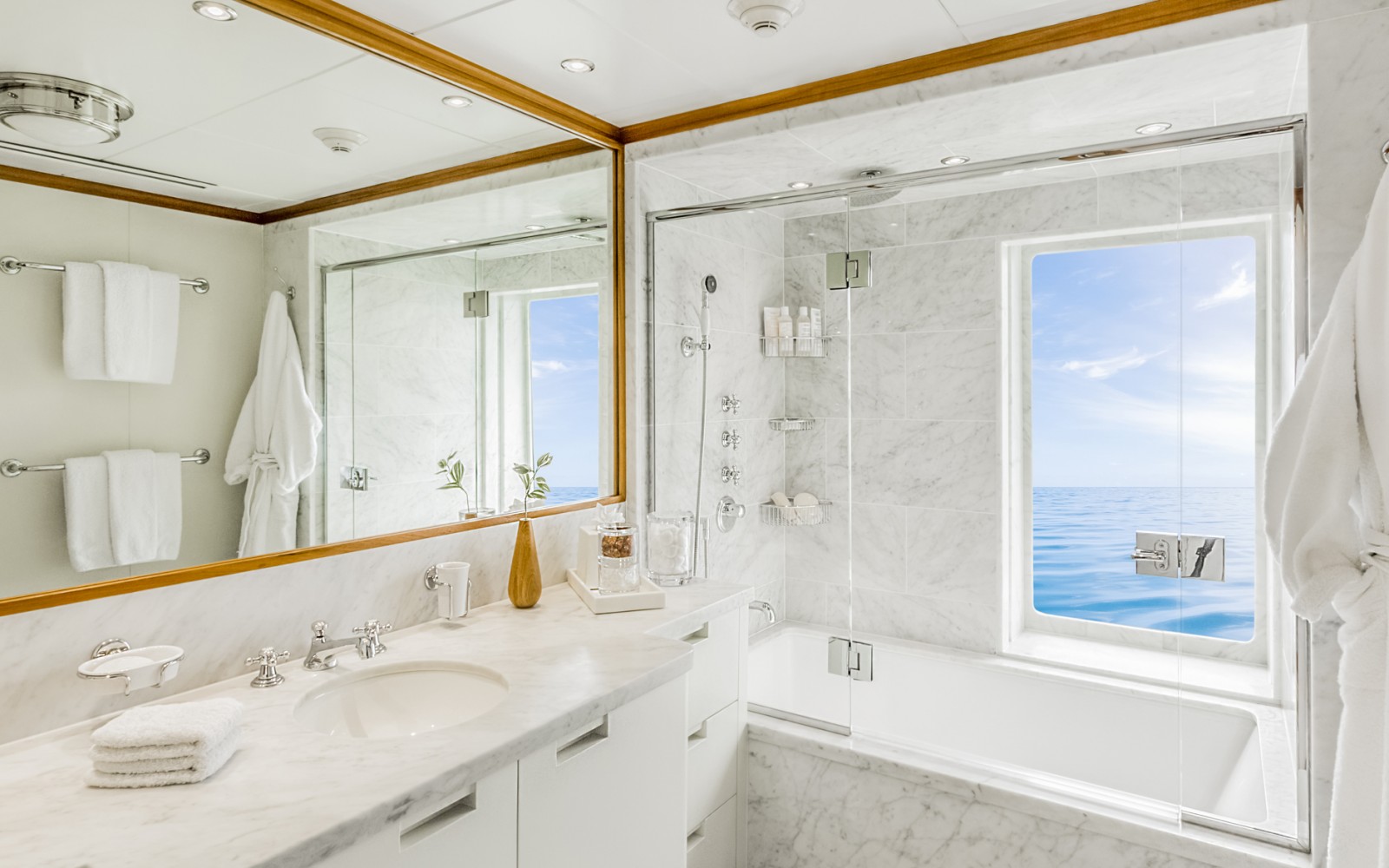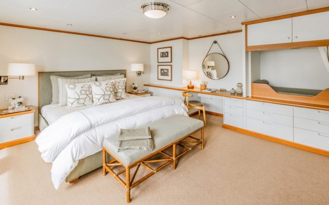 The accommodation is designed to sleep a maximum of 12 guests across 7 cabins: 1 Master suite, 4 VIP staterooms, 1 double cabin and 1 twin cabin, all of which have en-suite facilities. The dedicated crew of 17 will ensure that every guest is well taken care of throughout the journey.