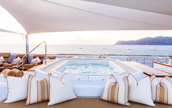 The sundeck is the perfect place to unwind as you take in your surroundings and guests have the option of sitting back in the forward lounge with panoramic views, or sink into the Jacuzzi or dine alfresco in style.