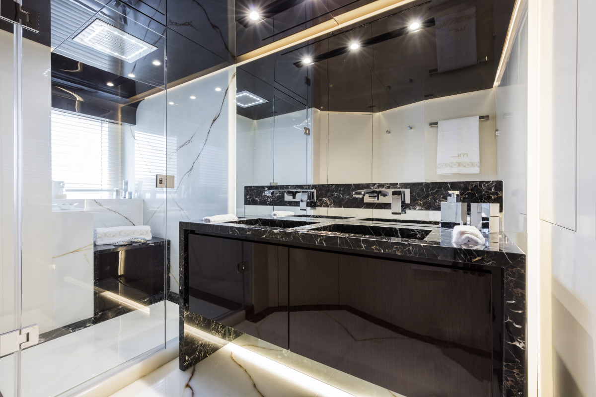 Internally, Dreamline 34m yacht offers deluxe accommodation in the owner’s suite positioned on the foredeck, and providing 270° views and access to a reserved deck area, which is completely private because of clever crew passageway and walkway design. In addition, there are four guest staterooms, all situated on the lower deck. Two of these are VIP cabins amidships, but there is also one double cabin and one twin cabin.
