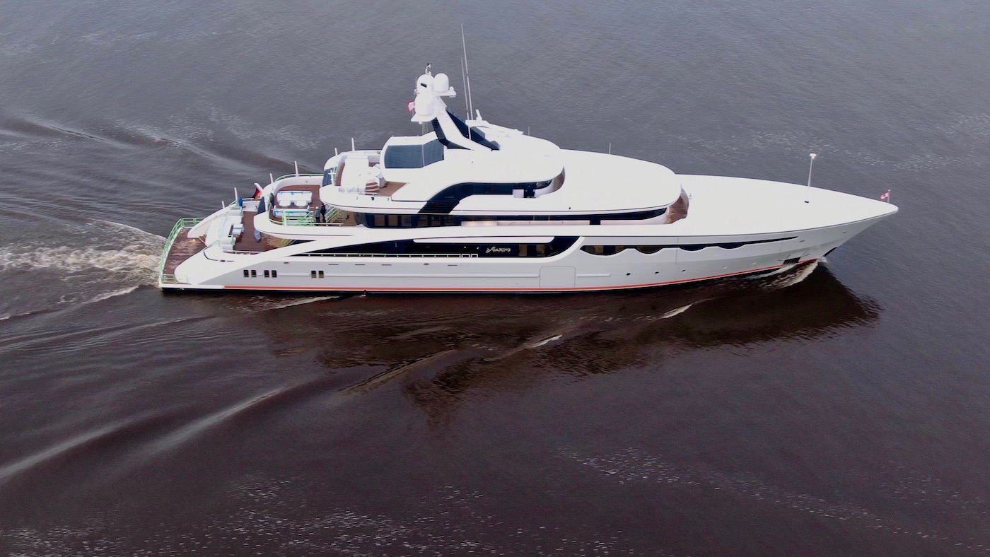 The shipyard was responsible for her naval architecture and exterior styling, and in the video, the sunlight gleams off the two curves along the stern that drop from two decks above. The silvery-grey hull is contrasted by a white superstructure and extensive dark glazing, and the bright orange waterline draws attention to the complimentary green-tinted underwater lighting.