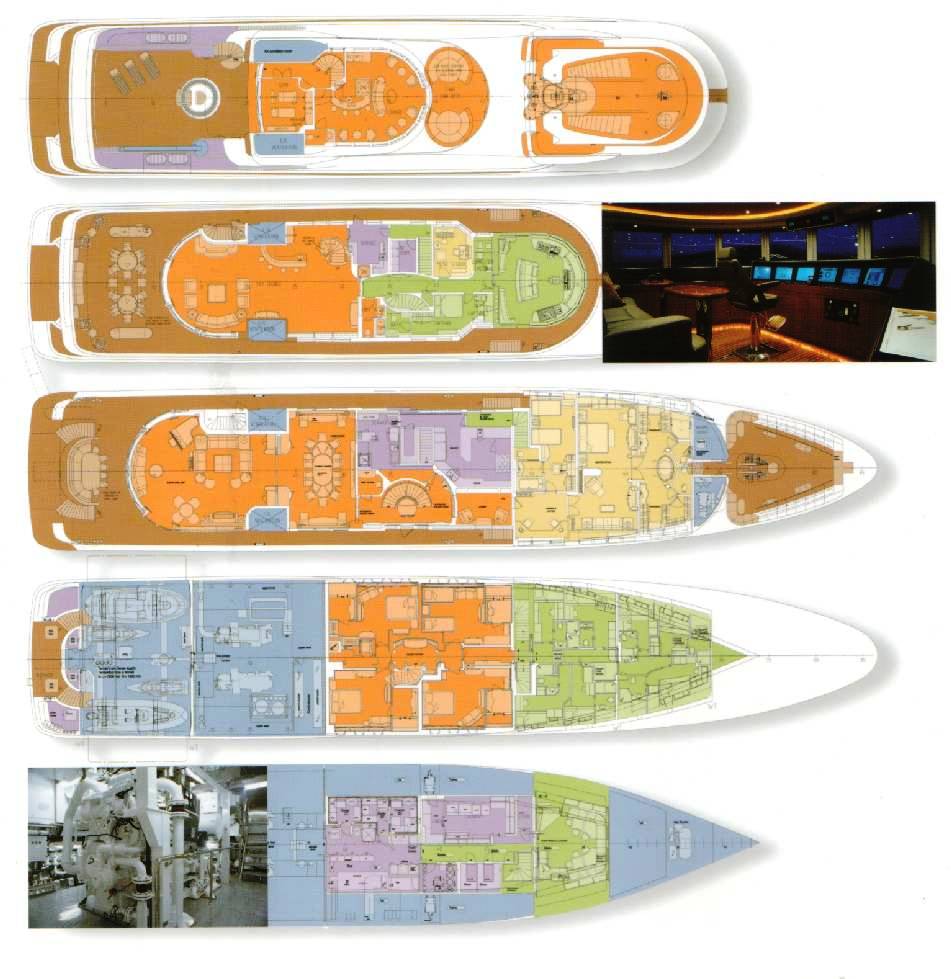 Sprawling over 5 decks M/Y Capri not only offers plenty of space but plenty of style and comfort also. The garage for the tenders is at the stern, with two hydraulic hatches so the boats can be launched and hauled aboard with extreme ease. The yachts size ensures plenty of space for jet skis, kayaks, bicycles and other leisure water sports.
