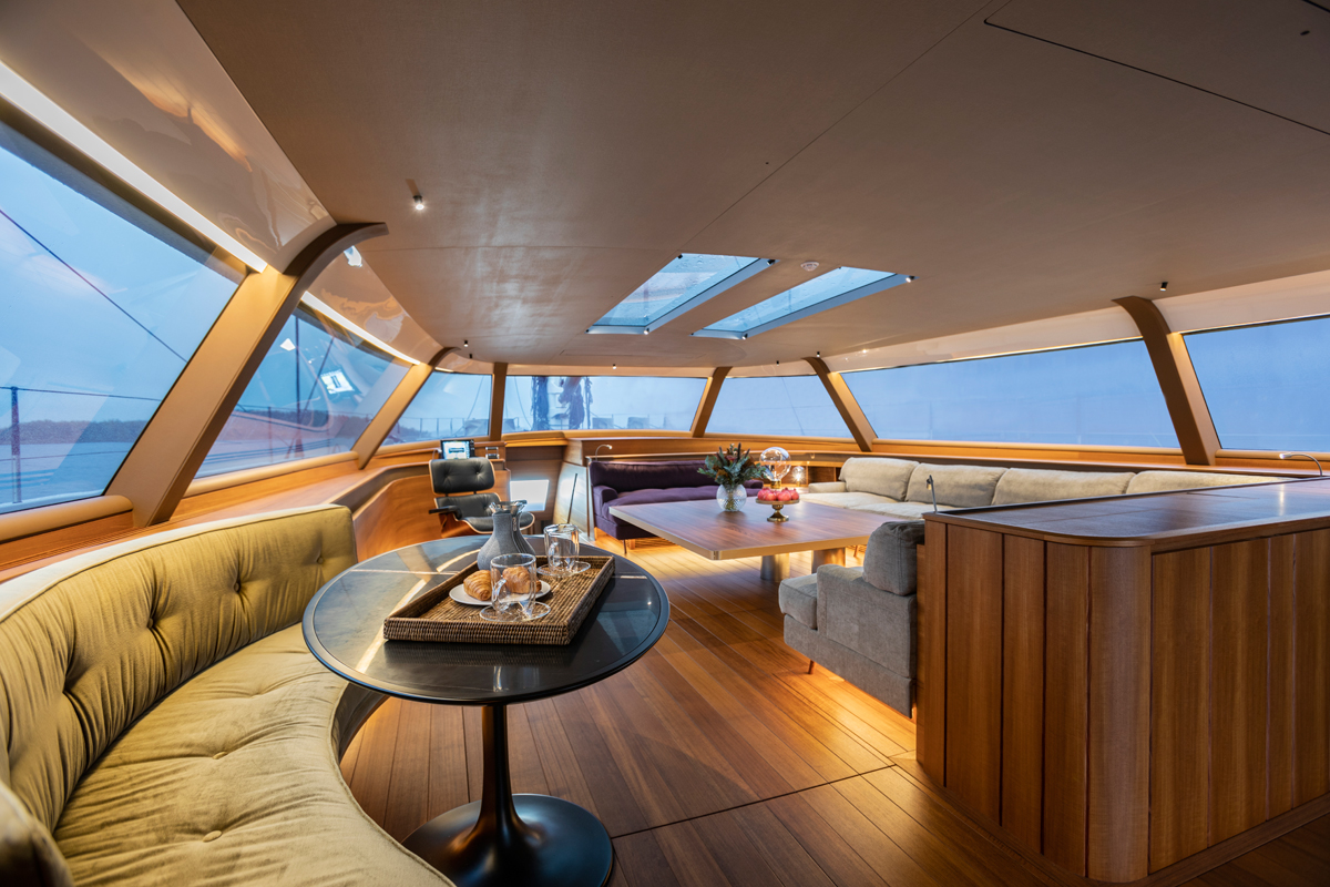 Canova is a powerful, fast and easy to handle a sailing yacht, designed with reduced environmental impact in mind, with reduced emissions through hydro-generation and electric propulsion. CANOVA was styled by Lucio Micheletti and her main feature is the superstructure’s long hard-top Bimini, which spreads from the deck saloon aft over the large guest cockpit and includes touch button top downside windows, sliding doors, ‘mood’ effect dimmable glass and the capability to take the 24-tonne load of the mainsheet track.