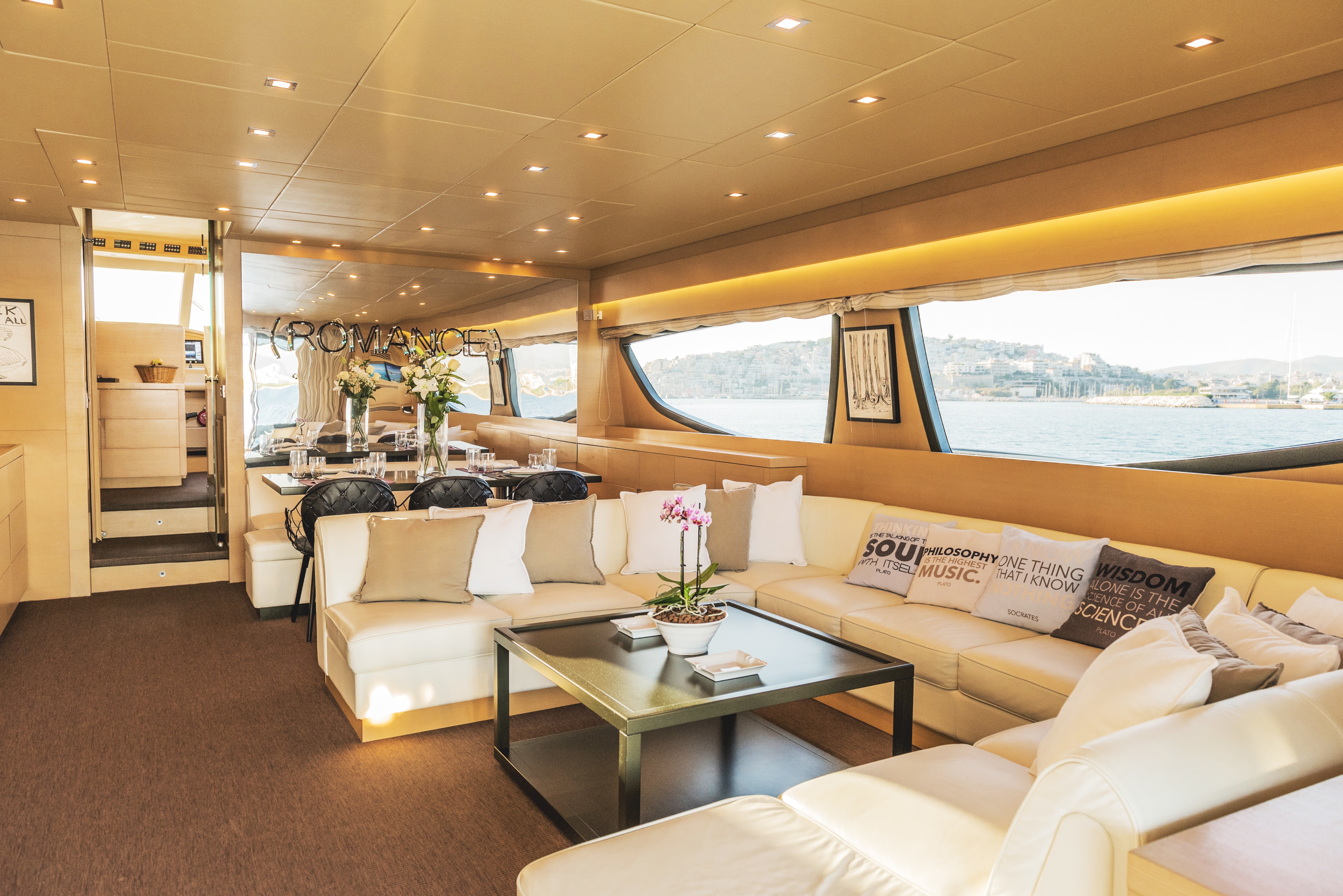 The yacht has a contemporary interior décor of neutral fabrics and light panelling throughout, which create a soothing relaxed atmosphere. Her open plan salon is ideal for gathering, featuring the lounge aft and dining forward, space is well-lit from elongated side windows and sliding glass doors aft.