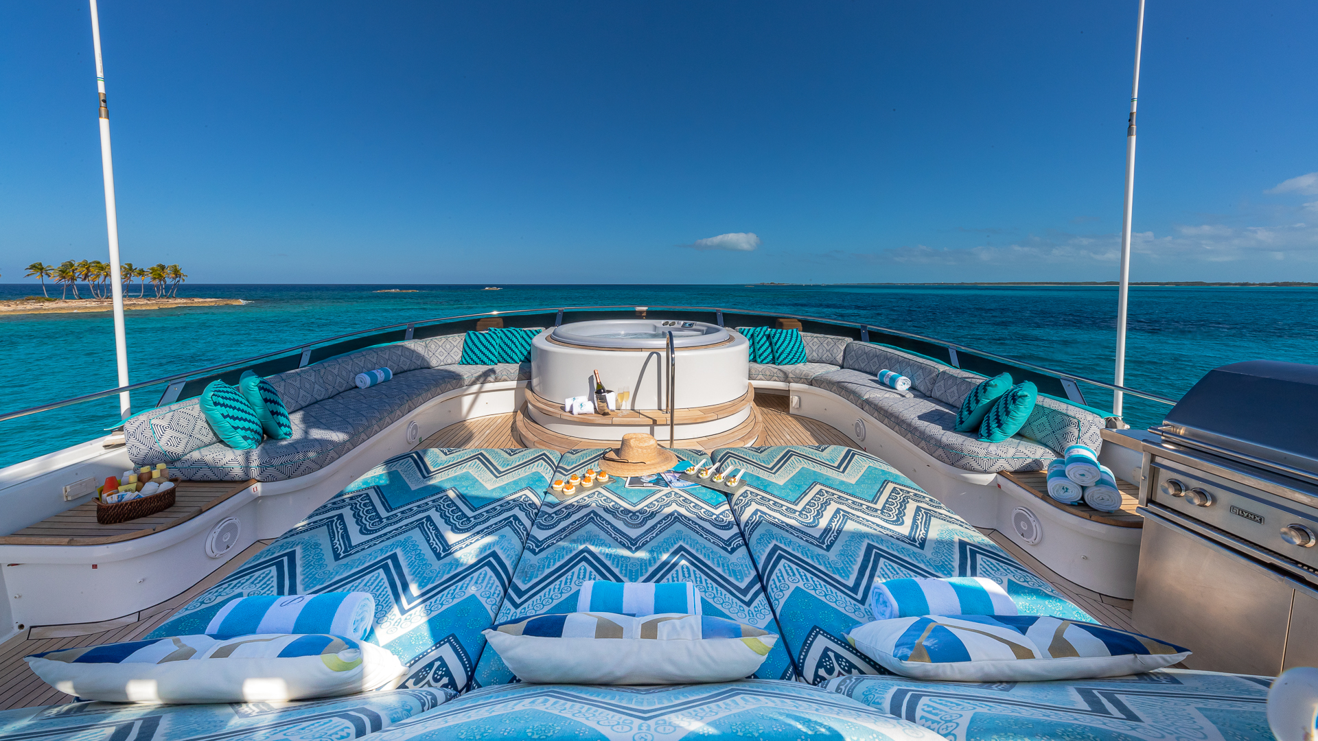 What better way to explore the crystal clear waters of the Bahamas or the glamour of Florida than onboard this classic motor yacht, refitted with modern conveniences and comforts.  The sun deck is a floating paradise where the on deck jacuzzi is surrounded by comfortable seating and a soft bimini can create shade if the sun is too fierce. The upper deck is the sociable hub with lounge and dining zones, plus from this level the crew will attach the slide and the kids – and adults – can spend the day enjoying the exhilarating activities and toys.