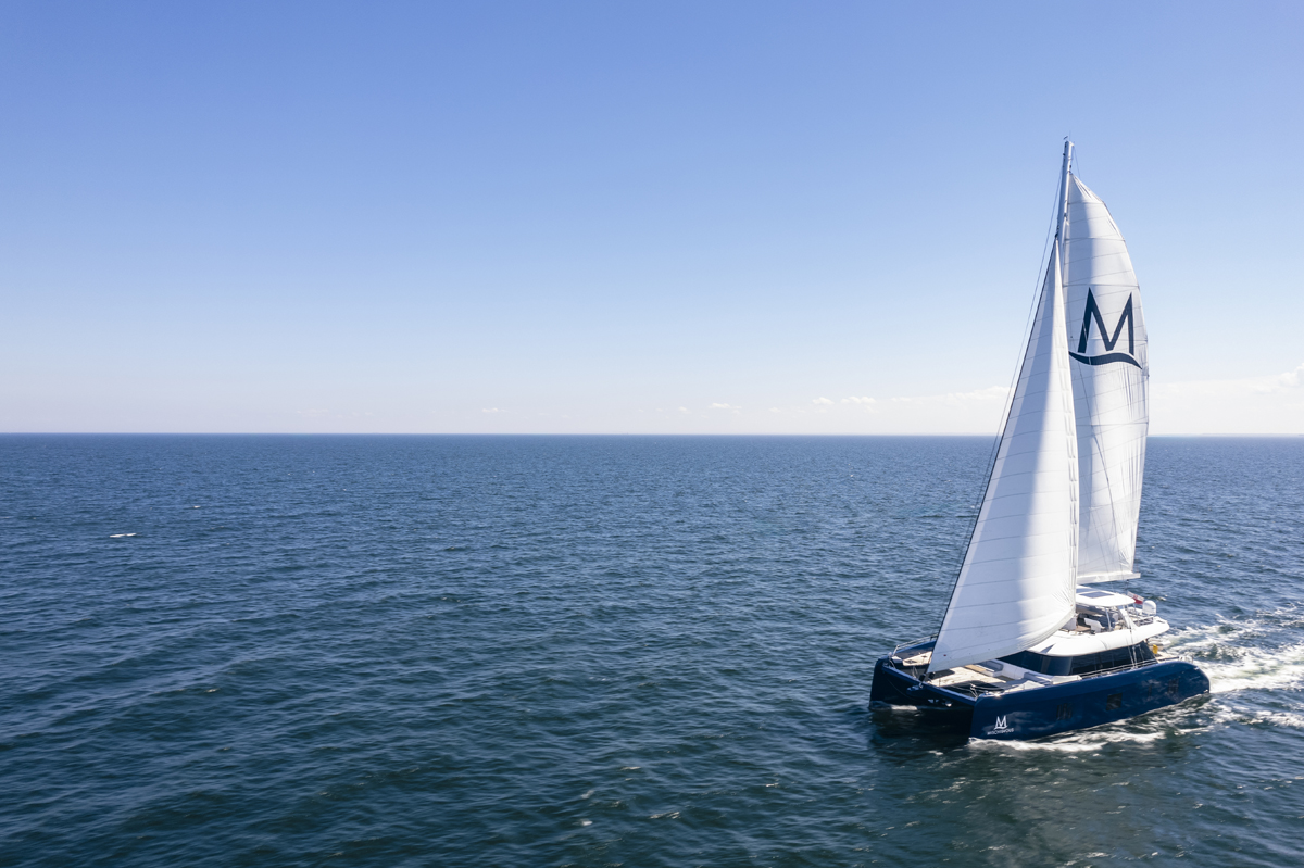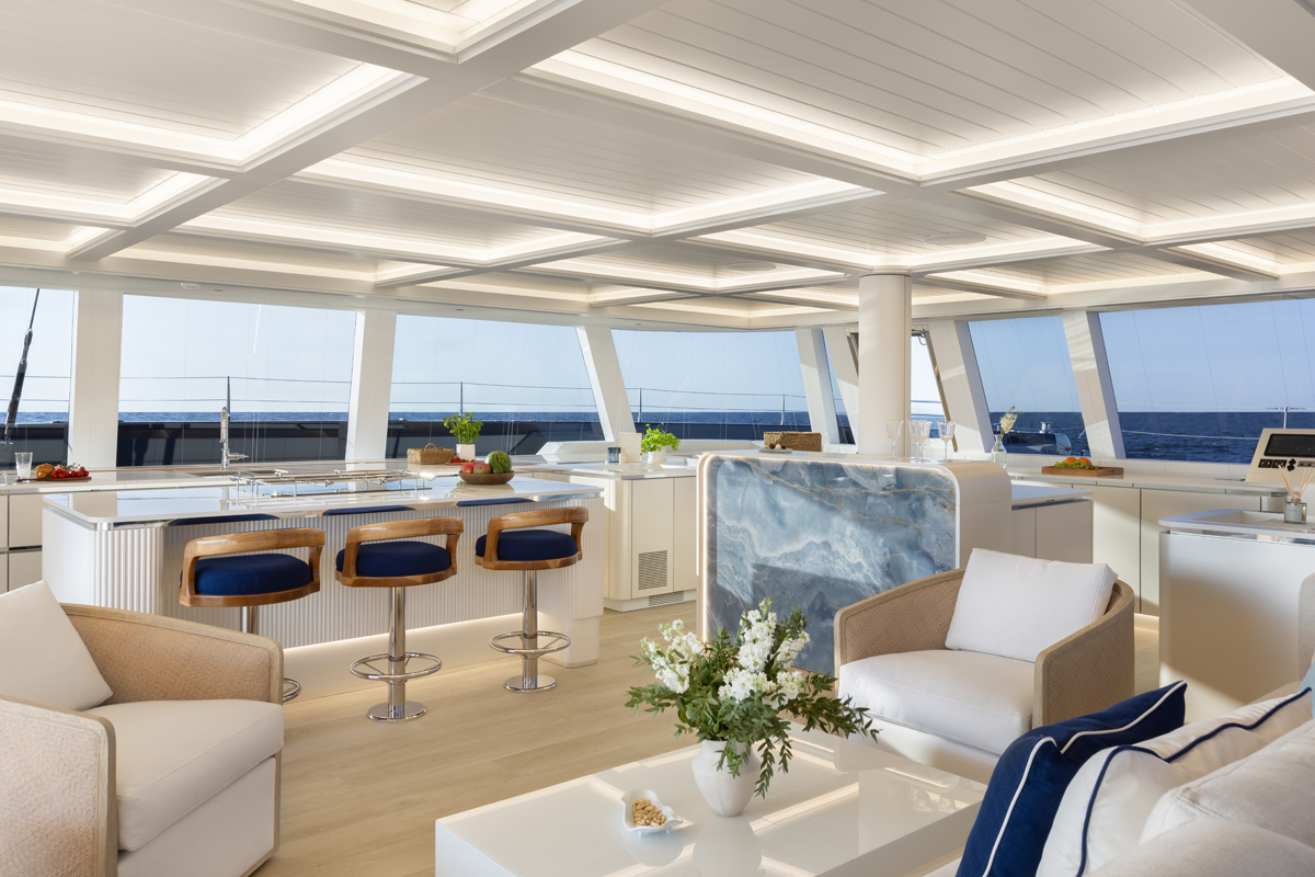 The catamaran exudes sophistication with its sleek exterior lines, cool blue hull and airy, light-filled interiors. Inside, a restful colour palette of natural tones, accented with soft blues, creates a serene environment that feels like a floating retreat.