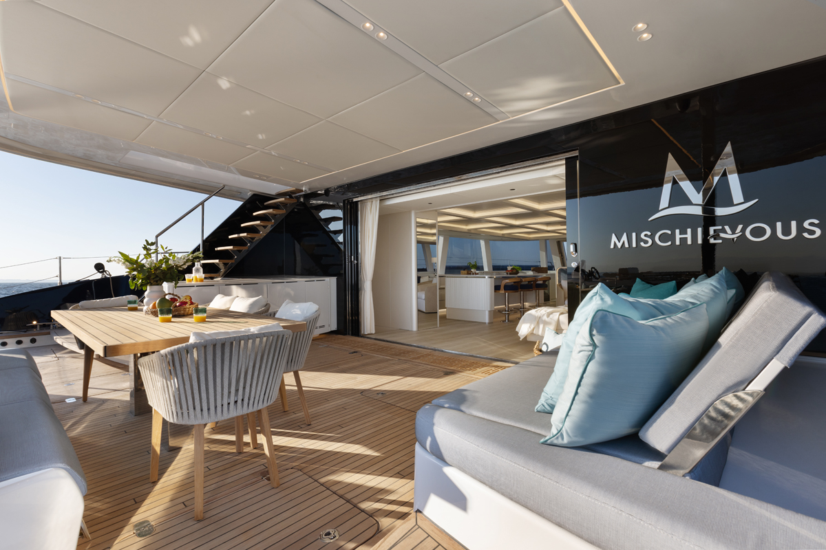 She has been crafted with alfresco living in mind and includes expansive outdoor spaces that allow guests to fully embrace the Caribbean lifestyle. The full-beam bow terrace is ideal for sunbathing, while the aft cockpit features a hydraulic platform perfect for water activities or lounging close to the sea. The standout flybridge offers modular seating, a bar, and a dining setting with panoramic views of the ocean.