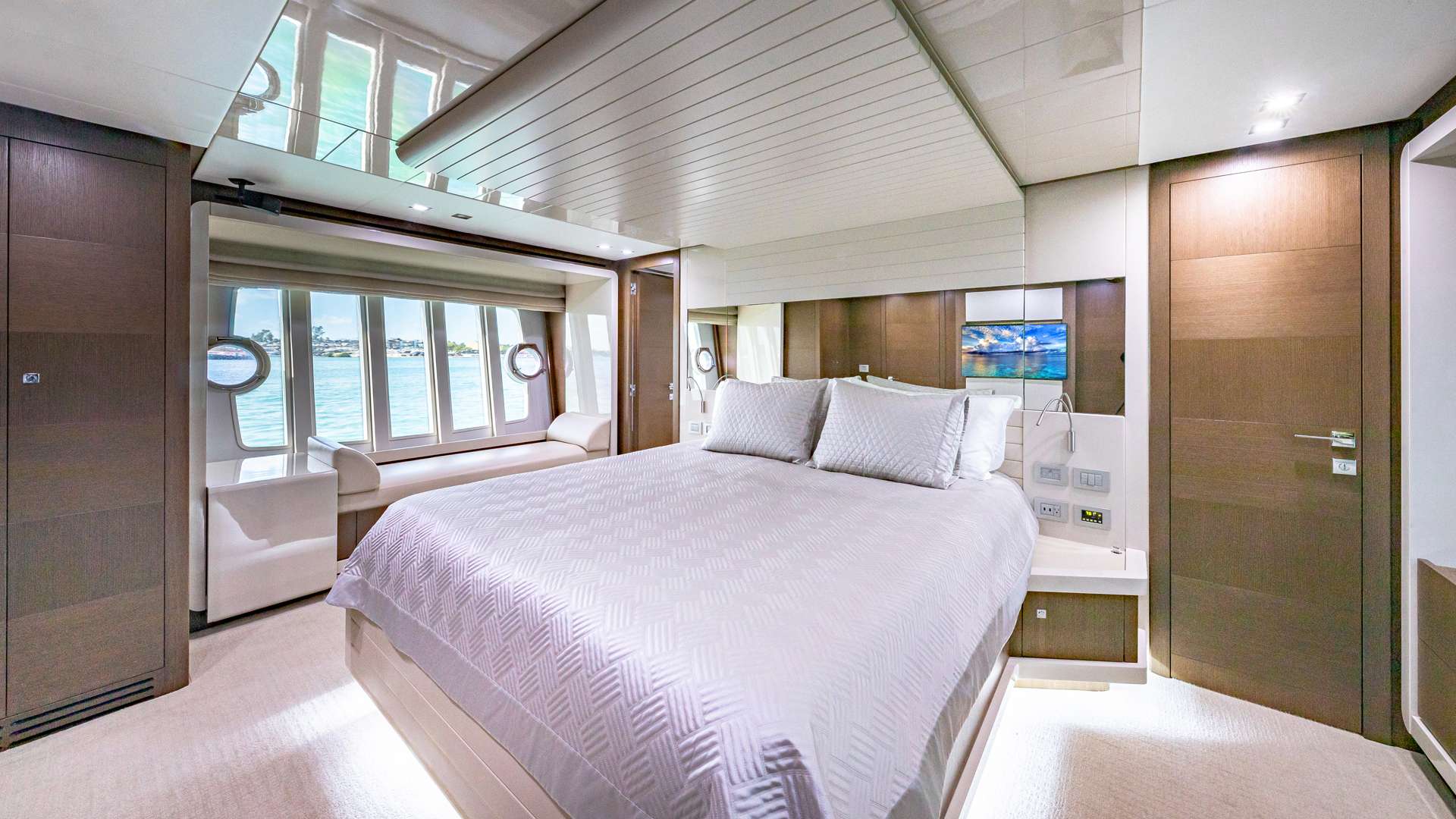 For an elevated view, the flybridge boasts a third dining area, an all-weather TV, an outdoor kitchen, and a jacuzzi, perfect for soaking in the warm Bahamian breeze. Sun worshippers will love the spacious bow sunpad, offering a front-row seat to paradise.