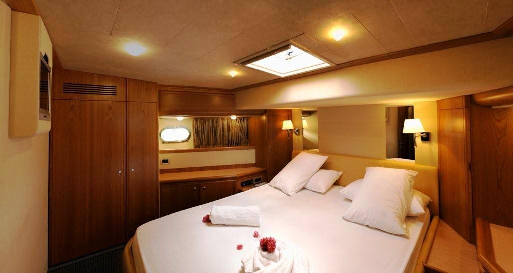 There are various on board areas for relaxation or social gatherings, such as the main deck where charter guests can also enjoy al fresco dining. The perfect place for all day fun and sunset cocktails is the flybridge, complete with a portable barbecue, a fridge and plenty of seating with a cocktails table as well as sun beds to soak up to warm sun. Guests have also the possibility to relax on the foredeck offering more privacy and additional sun pads.