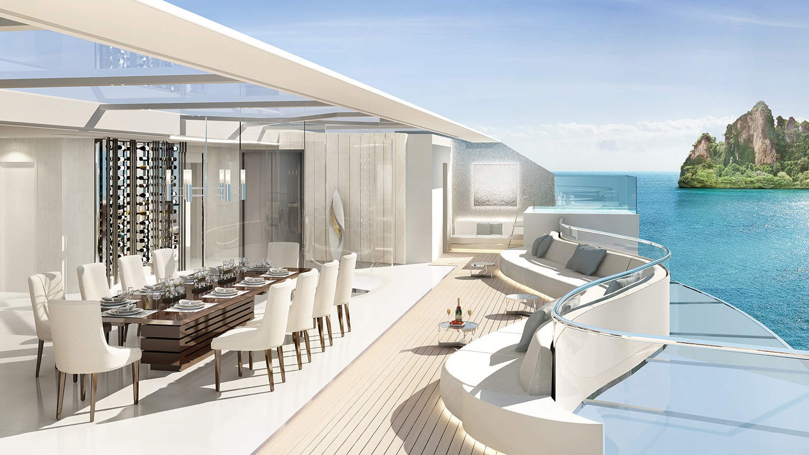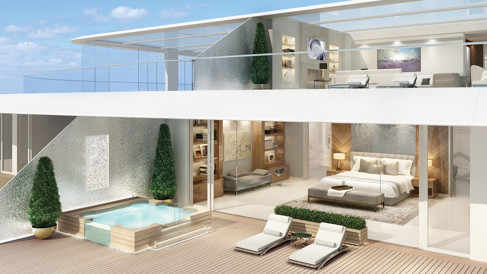 Luxury yacht NJORD is currently under development with Ocean Residences and once completed she will contain that will accommodate 118 private residences available for purchase in 20 different configurations varying in size from two bedrooms up to six, covering 116m2/1248.6ft2 to 800m2/8611ft2. There will even be 16 guest cabins with a butler service and each will have its own private lounge with floor-to-ceiling windows for sea views and a private terrace.