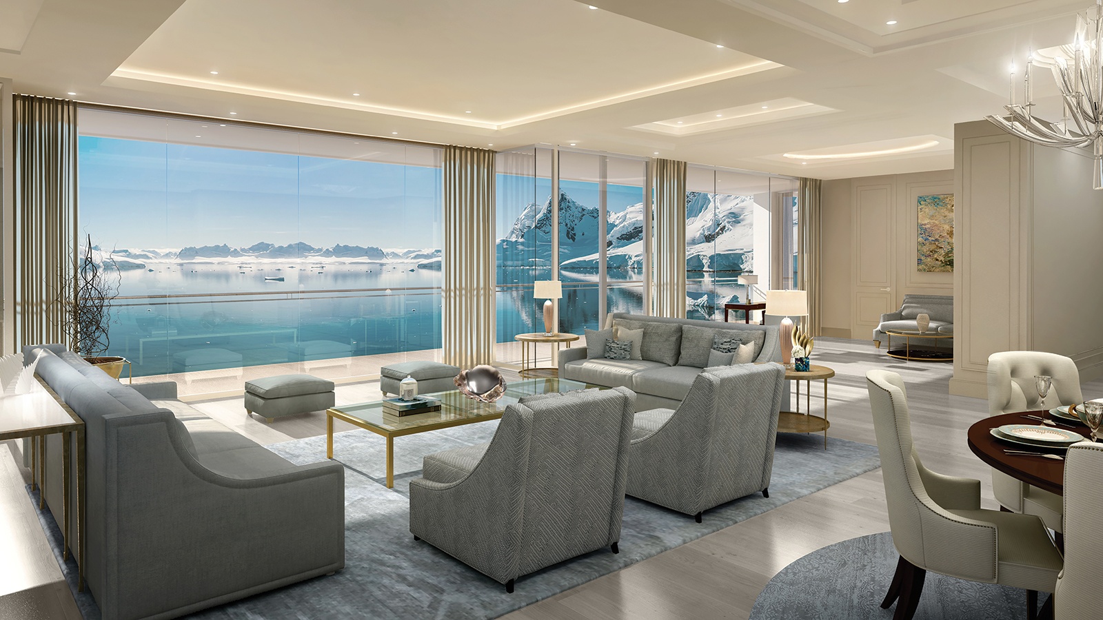 Comfort, privacy and security are of utmost importance on board, and guests can personalise their cabins with decor and furniture to match their tastes and requirements. The luxury amenities include a sundeck, a telescope observatory lounge on the top deck, a night club and jazz lounge, two outdoor swimming pools, an indoor hydro pool and a comprehensive wellness centre. The expert crew of 311 will each have their own private cabin and ensure that guests have first-class service throughout every journey.