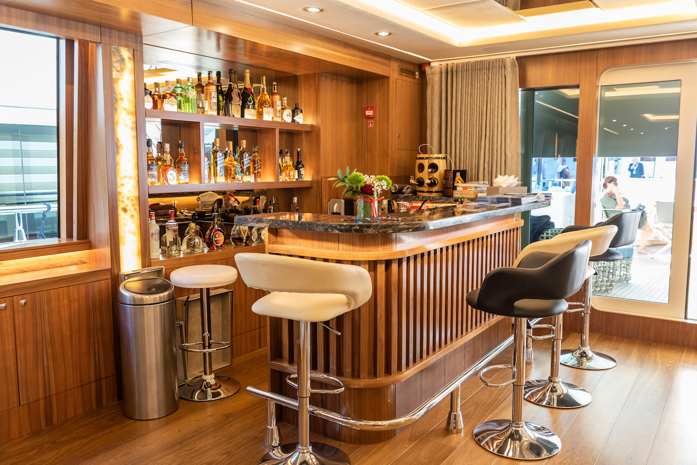 Her interior décor is stunning and elegant, with beautiful woods and custom neutral furnishings. The generous salon is perfect for entertaining with family and friends, featuring a lounge, fully equipped cocktail bar and formal dining.