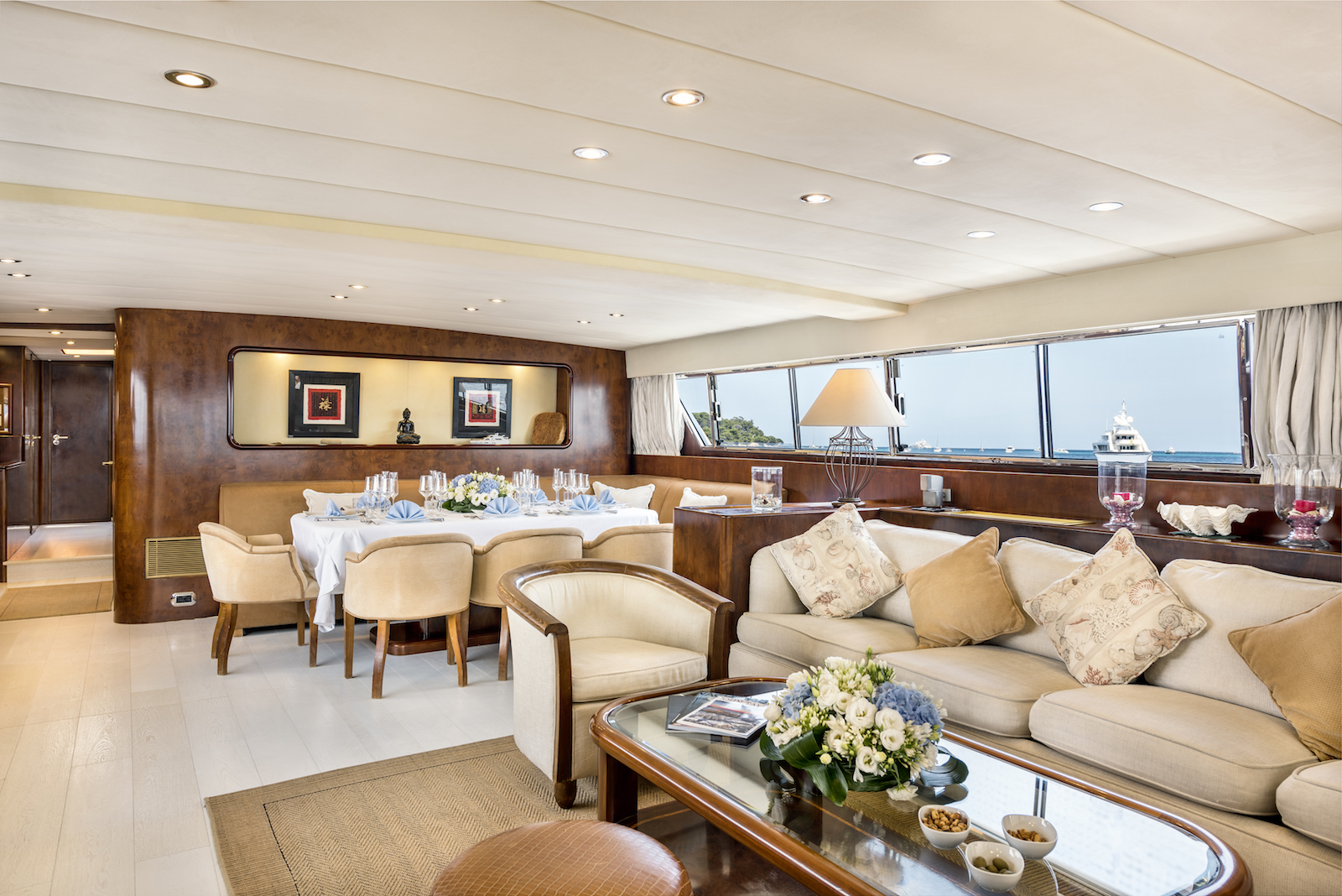 Her interior is characterised by neutral colours with walnut panelling, combined with elegant furniture and expertly matched pastel-coloured fabrics, creating an overall inviting and pleasant ambience on board.