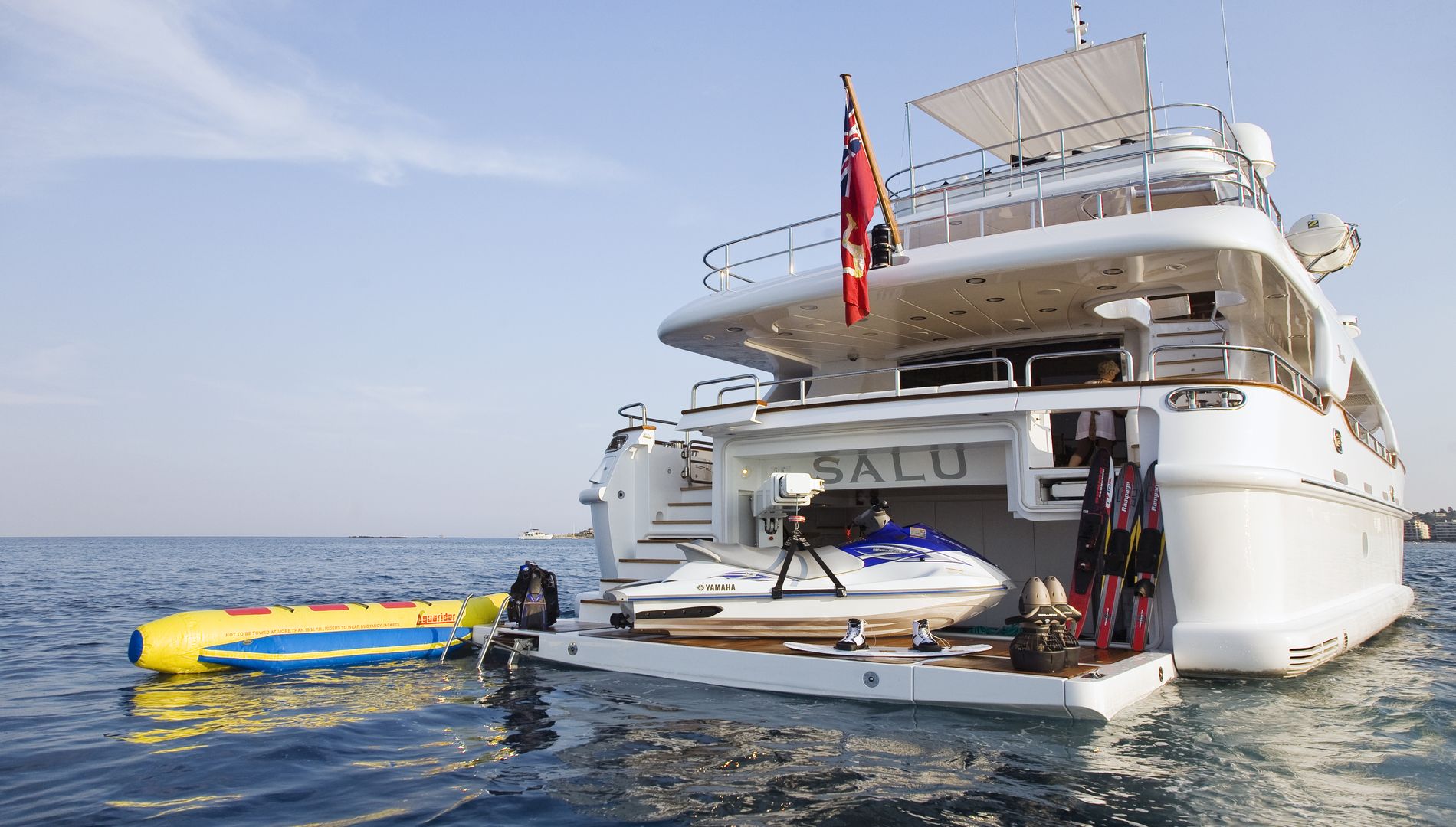 On deck, M/Y SALU offers charter guests 4 areas to enjoy. Her shaded aft deck has alfresco dining and leads directly to the swim platform and a vast assortment of water toys.
