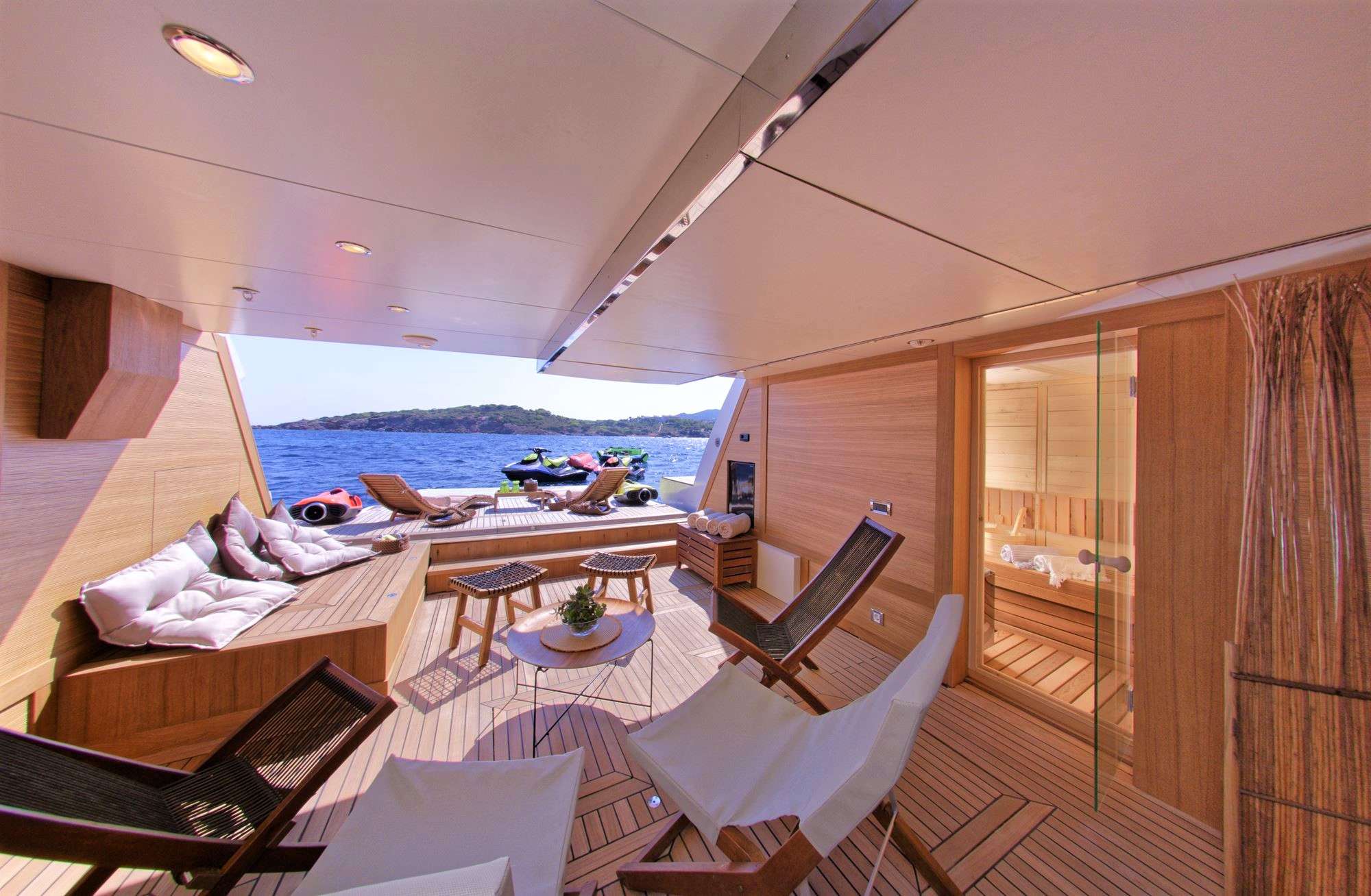 As a tri-deck superyacht, GRANDE AMORE is designed for both relaxation and entertainment. Her expansive beach club offers plush seating, sun loungers, a sauna, and a shower, while the main aft deck features alfresco dining with seamless access to the salon. The bridge deck aft provides multiple lounge areas with cocktail tables, perfect for sunset drinks. For the ultimate indulgence, the sundeck has a luxurious jacuzzi, oversized sunbed, casual dining area, a fully stocked bar, and optional shade, ensuring guests enjoy every moment in complete comfort.