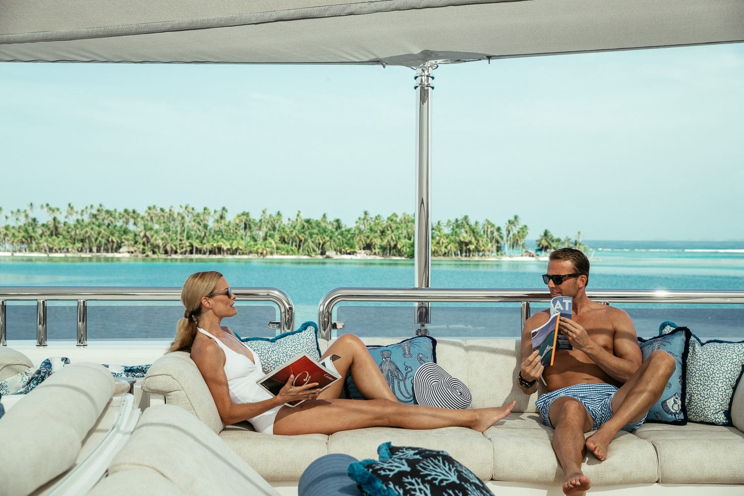 Her interior décor is timeless. Entering the main salon, a lavish lounge with neutral fabrics, light panels and warms woods create an elegant ambience, 2 opposing sofas and a centred coffee table invite complete relaxation. Further forward, in a semi-open plan is a formal dining arrangement. On the upper deck, a more casual sky-lounge has ample seating and a games table, perfect for socializing. Both the main and upper lounges receive plenty of natural light from panoramic windows while framing the beautiful Tahitian scenery.
