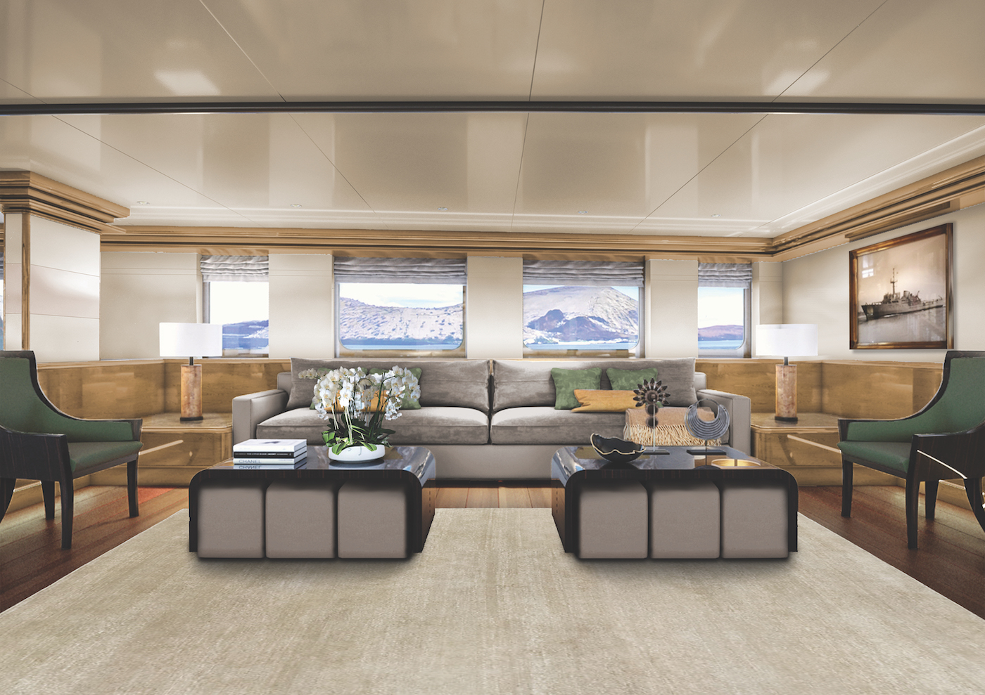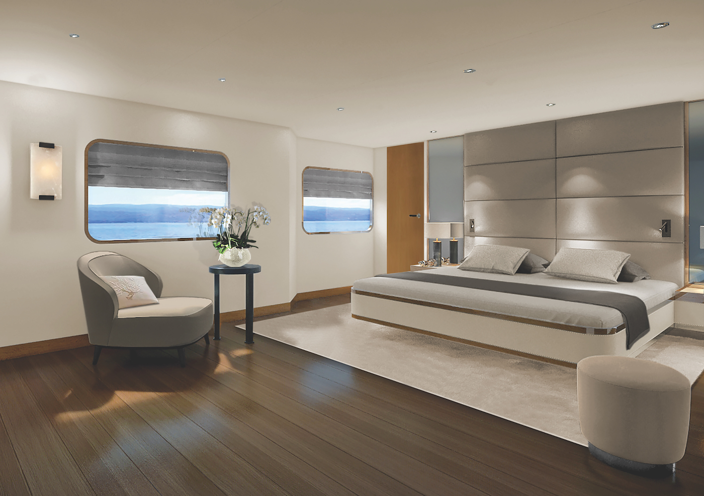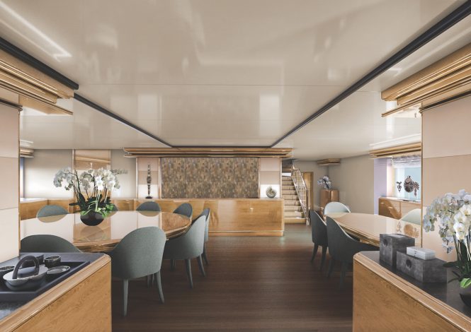 Commencing her inaugural voyage in November 2019, RINA-classed superyacht AQUA BLU is currently receiving a band new interior from famed designer Cor D. Rover, and current concept images reveal a modern and minimalist style made homely by golden tones in the wooden panelling that can also be found in the fixtures and accessories, creating a ‘brass-and-ivory’ themed interior, while contrasting colours in ash and charcoal greys in the furniture provide a cool and grounding element.