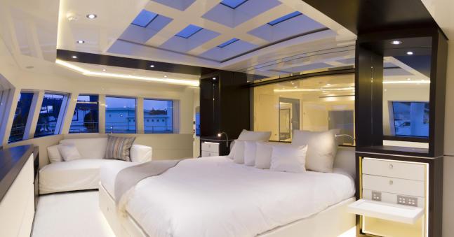 Whether you are looking to relax in the Seychelles or go for a fast-paced holiday amongst the waves, superyacht ENIGMA XK has excellent facilities for up to 12 guests. Vitruvius designed her layout for efficient use of light and space whilst ensuring comfort and an intimate atmosphere between guests. The 360° glass surround main saloon epitomises this mind-set by using a neutral palette and bright whites to create the illusion of larger furniture. The ‘U’ shaped sofa setting is the perfect place to socialise or stretch out and watch a film together.