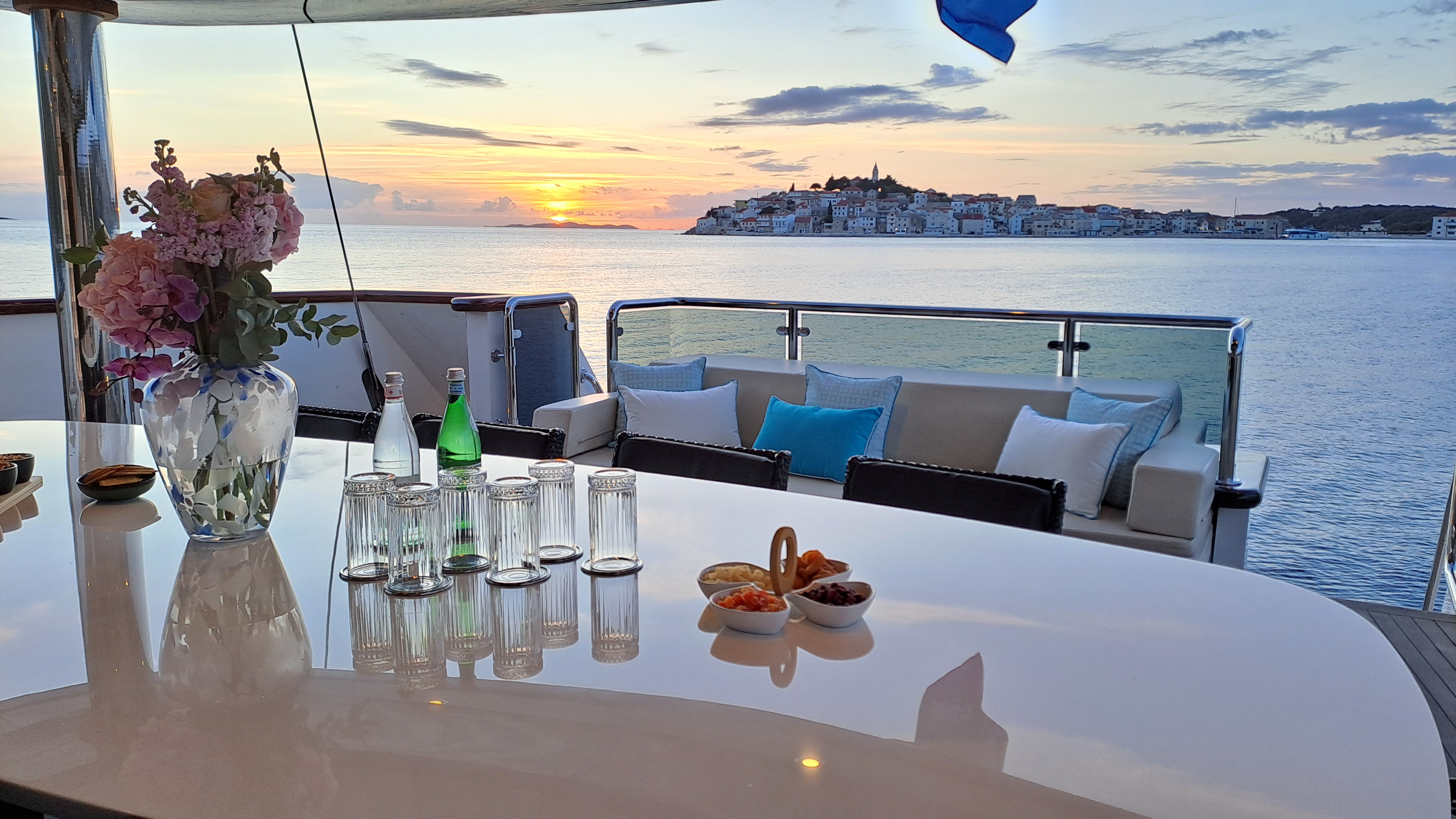 On deck, OMNIA provides ample relaxation spaces, including a shaded aft area for alfresco dining and lounging/sunning. The upper deck offers further indulgence with a deluxe jacuzzi, expansive built-in sunbed aft, and additional seating options forward.