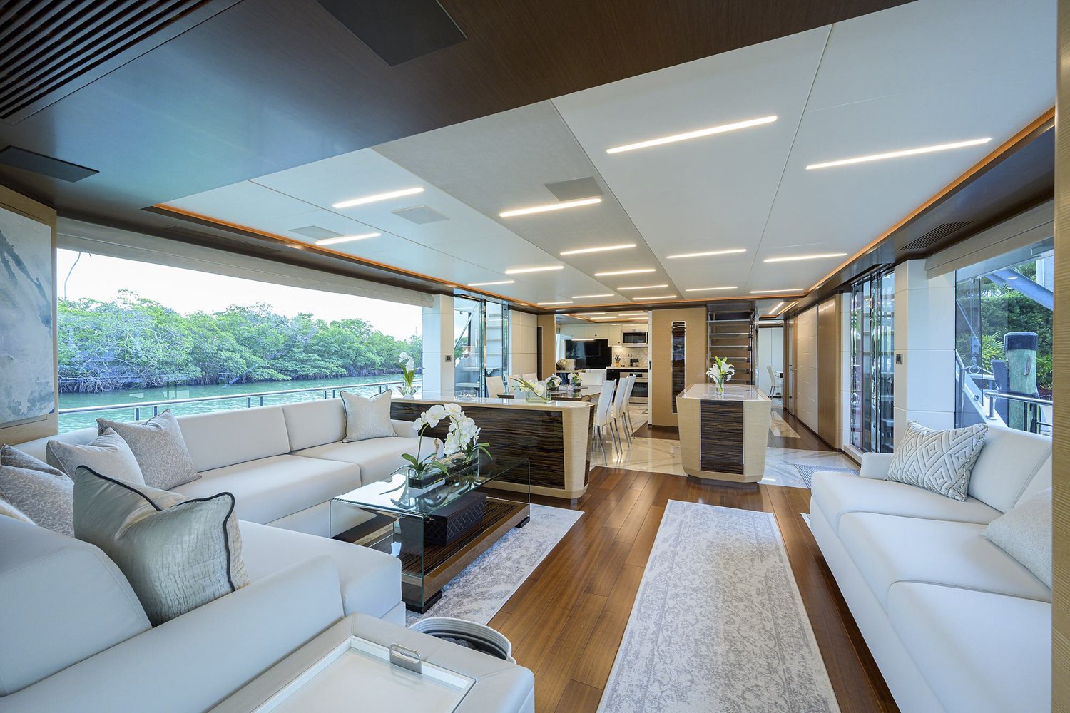 Luxury yacht VOYAGER can accommodate up to six guests in three lower deck suites while her layout is perfect for charter vacations and includes both a main salon and additional sky lounge. The main salon offers a lounge and dining room with a flexible galley which can be open to the salon or closed off to reduce the impact of cooking. The galley also includes a banquette seating area, perfect for informal dining or for kid’s meals.
