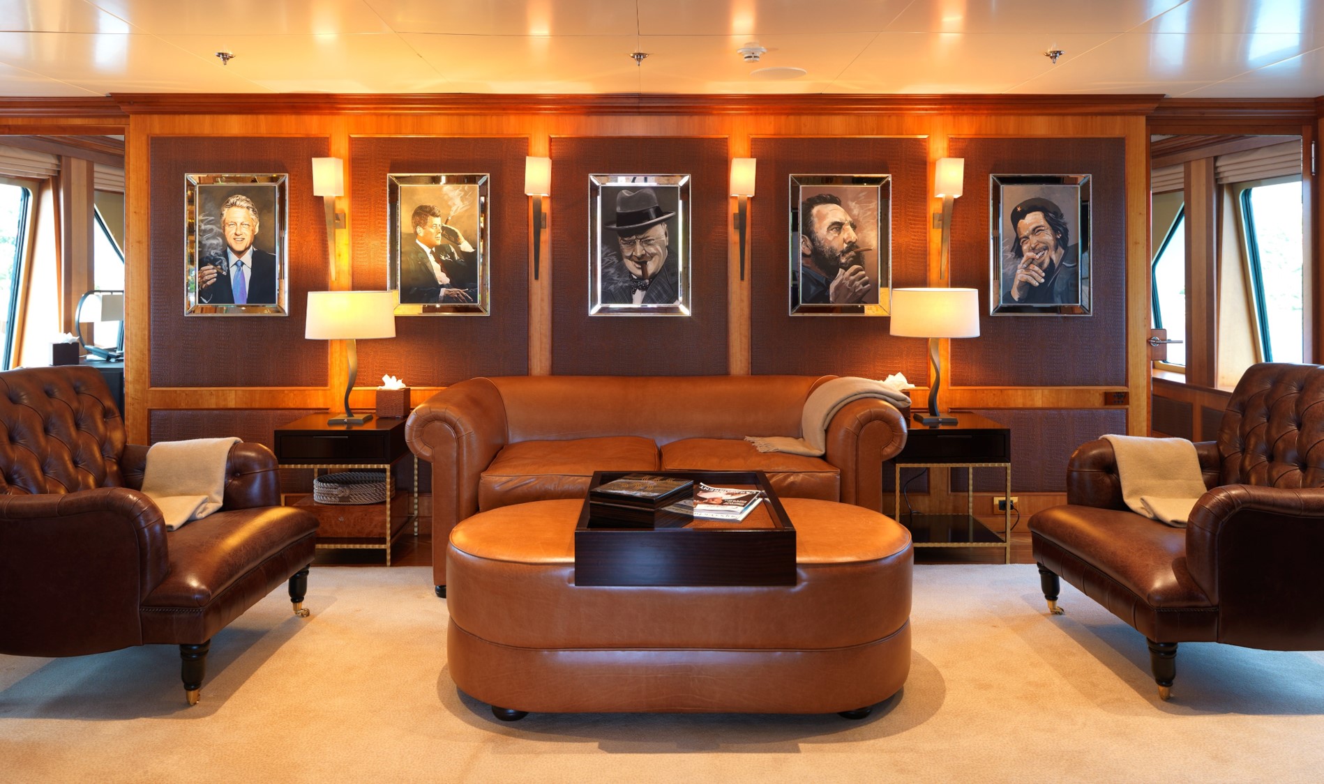 What would be the skylounge aboard most vessels is the cigar room aboard this superyacht! Situated on the upper deck aft, famous cigar smokers of the past century adorn the walls of this distinctive gentleman’s lounge. An entire wall cabinet is dedicated to vintage cigars and a choice whiskeys accompanied by crystal glasses. Overstuffed leather armchairs are placed in the centre of the room and the widescreen TV for the latest sports and a large library of films. A desk in the corner lets the room be used as an office by charter guests who need to keep an eye on business matters.