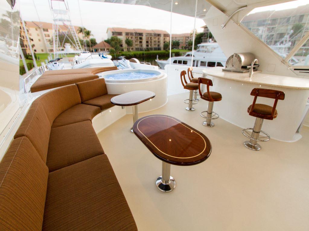 Exterior spaces are spanned over two decks. The main salon provides access to the shaded aft deck and alfresco dining table. There is a large Jacuzzi tub, sun pad, wet bar and comfortable seating on the sun deck, which will definitely be the centre of day leisure and entertainment. Enjoy some delicious meals while cruising in waters of America, at the sundeck BBQ station and cocktail tables.