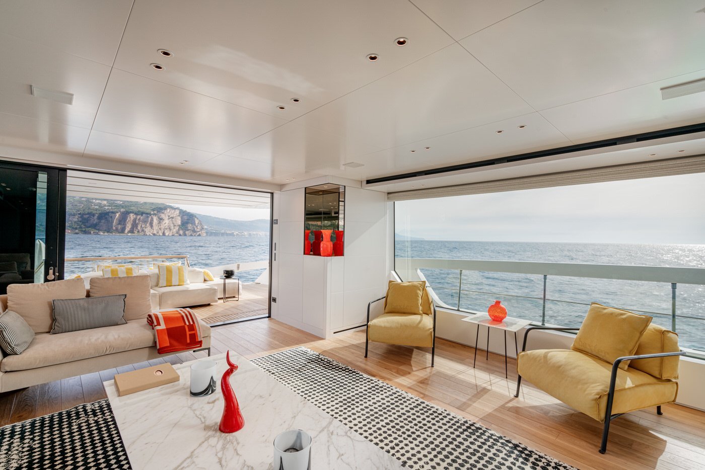 Meanwhile, the interior is a delight, with neutral Scandinavian inspired furnishings and finishes creating a welcoming atmosphere for guests while on board. Contemporary pops of colour: bright yellow, orange and red add character throughout the salon and the four ensuite guest cabins.