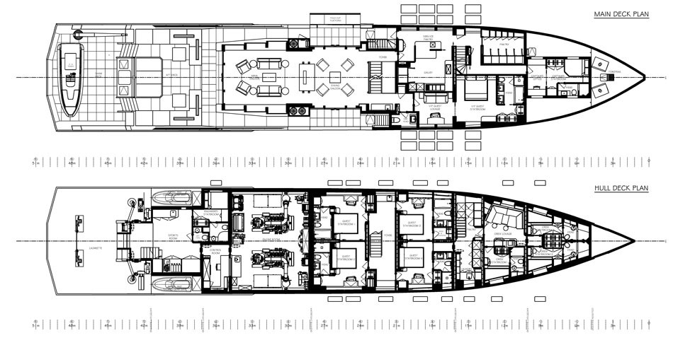 4 x Guest staterooms located on the Hull Deck with capability to convert to 2 x VIP full width staterooms.