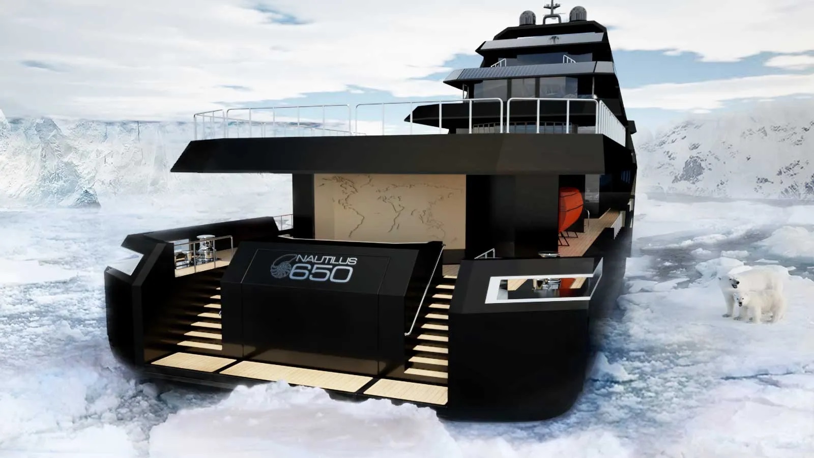 68m concept explorer yacht NAUTILUS 650 MY2023 has been unveiled by Dynaship Yacht Design with an imposing matt black exterior. This BLACK WHALE edition is a green-powered explorer yacht designed with an ice class hull to withstand extreme Antarctic conditions and low emission generators to lessen environmental impact.