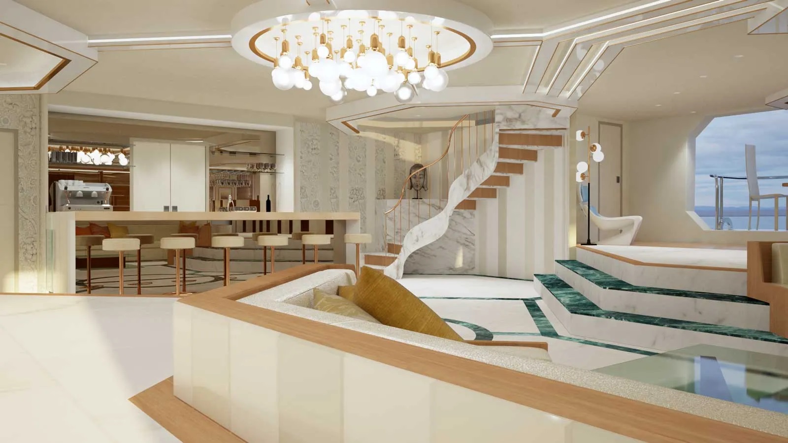 The interiors are elegant and based around a sociable central hub featuring natural materials like timber and marble with accents of gold and plush soft furnishings to add warmth. The central staircase allows seamless access between deck levels for both crew and guests and unites the various dining, lounge and service spaces.