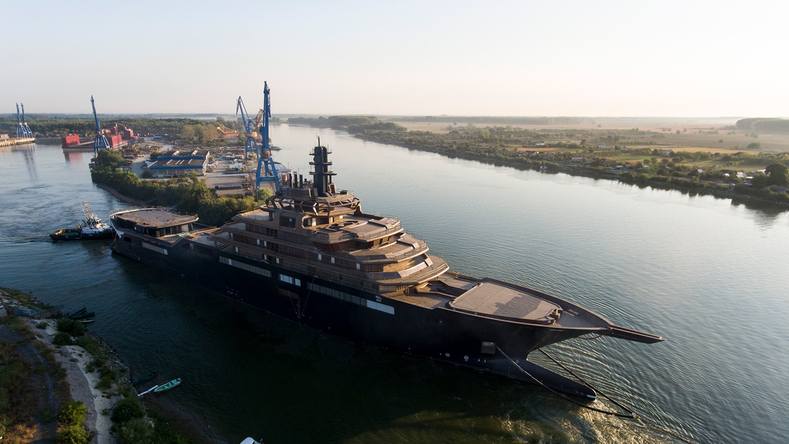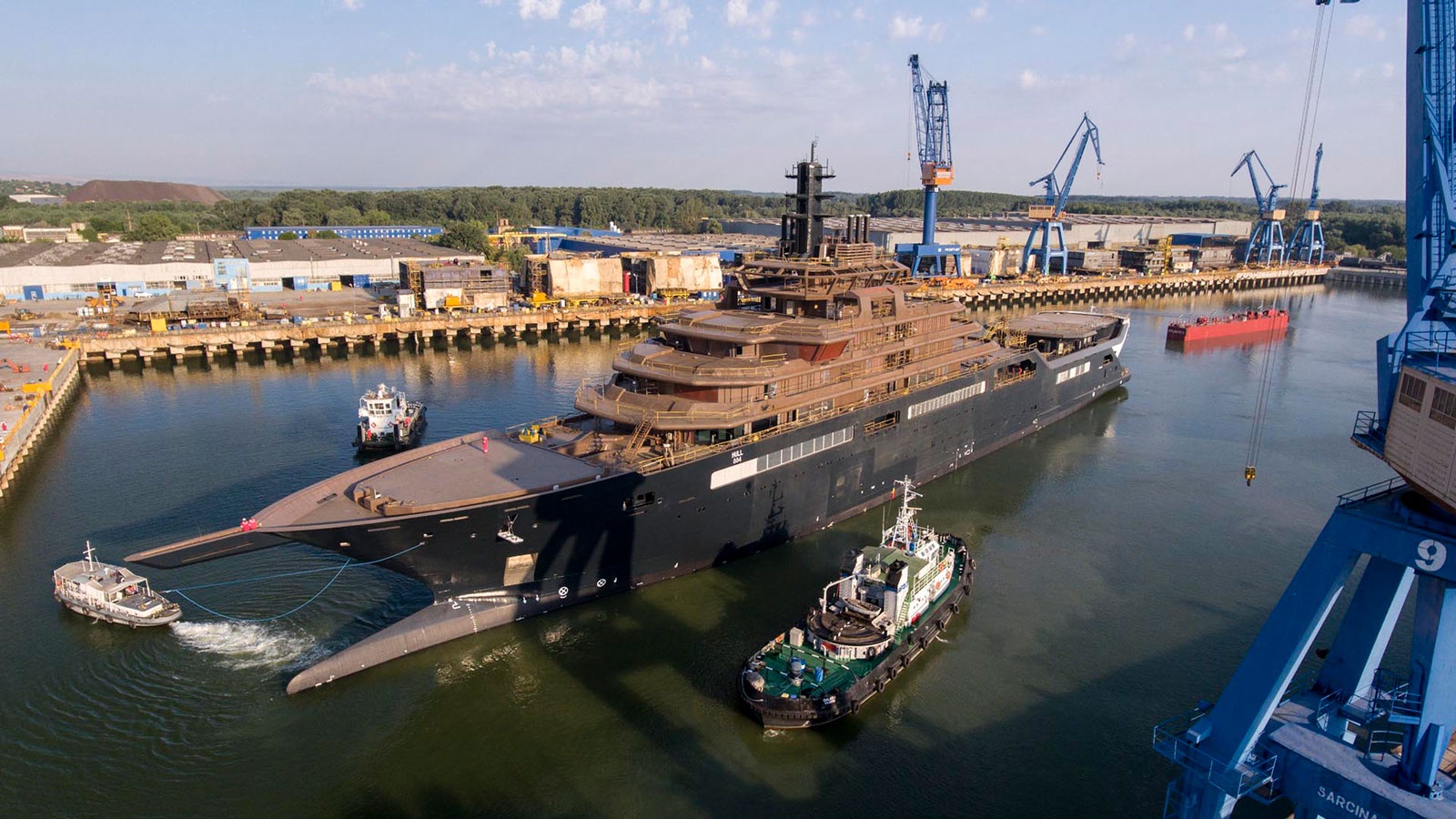 Expedition yacht REV was launched late in August and is now being towed to Norway to begin the outfitting process.